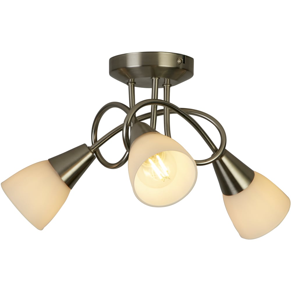 Add timeless elegance to your home with this stunning 3-shade ceiling light. Antique brass twisted arms and crisp white glass shades combine to create a warm, inviting ambiance. Energy efficiency is ensured with its use of 3 x E14 golf ball LED bulbs (not included). Perfect for living rooms and dining areas alike.