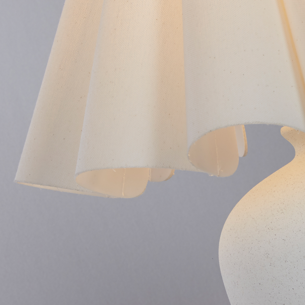 A timeless ceramic table lamp, exuding understated elegance. Its delicate scallop-edged shade and gracefully curved vase-shaped base blend modern and traditional aesthetics seamlessly. The all-white finish offers sophisticated simplicity, making it a versatile choice for any room. Create a soft, ambient glow in your living room, bedroom, or hallway with this effortlessly stylish lamp.