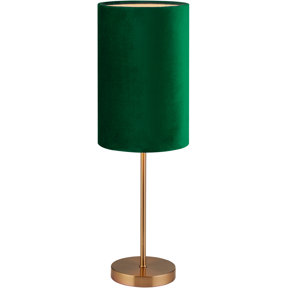 Elevate your home's style with this slender table lamp. Its deep green velvet shade exudes luxury, beautifully complemented by a sleek gold base and stem for a contemporary feel. Perfect for smaller spaces, this lamp provides ambient lighting without overpowering the room, making it an ideal addition to any bedside table or side surface. A chic and practical choice, it seamlessly blends beauty and functionality.