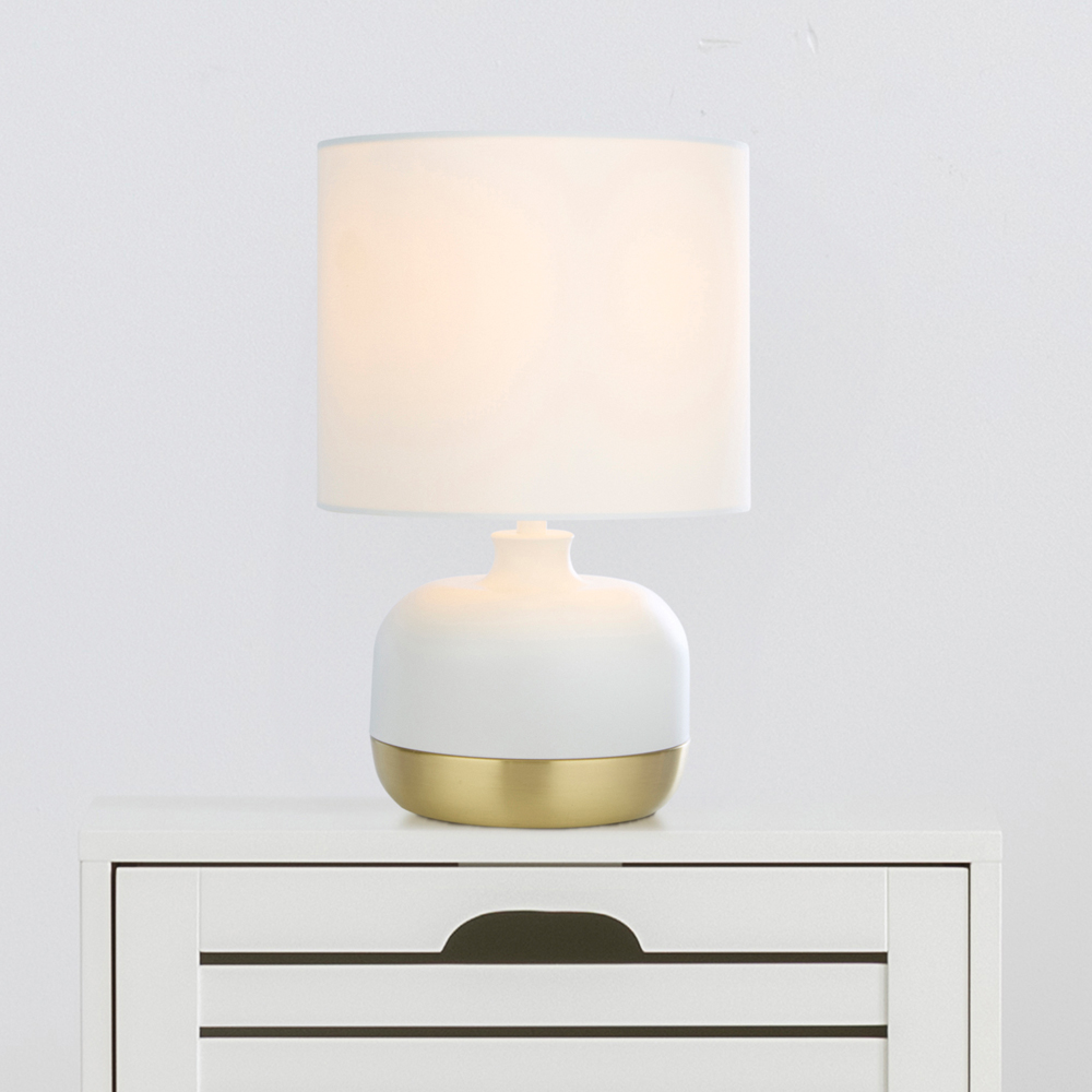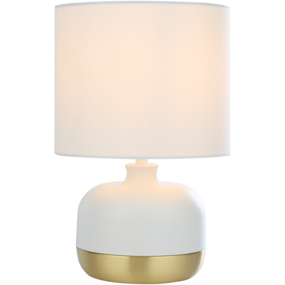 The Ezra White and Gold Touch Lamp from the Lighting Collection brings understated elegance to any room. Its matte white base is stylishly accented with a gold stripe. Enjoy the convenience of a touch dimmer switch with three brightness settings, ideal for creating the perfect atmosphere, whether you're relaxing or reading. This lamp effortlessly combines modern design with practical functionality.