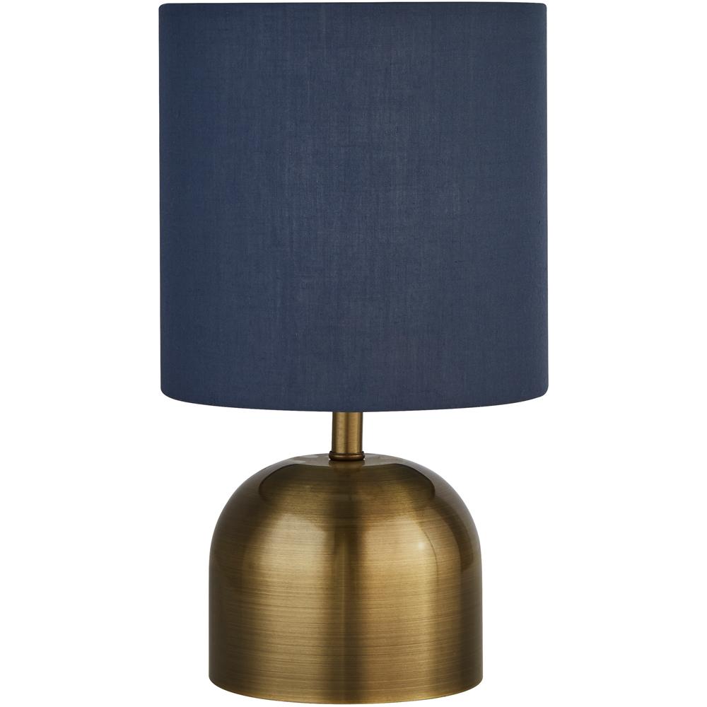 A sophisticated yet practical table lamp, perfect for adding a touch of modern elegance to your home. Its satin brass dome base and striking navy blue fabric shade create a stylish statement. Effortlessly adjust the light level with the convenient touch dimmer, ideal for both relaxation and focused work. Standing at a perfect 27.5cm, it's ideally sized for a bedside table or desk. Simply add a candle LED bulb (not included) and enjoy the ambience.