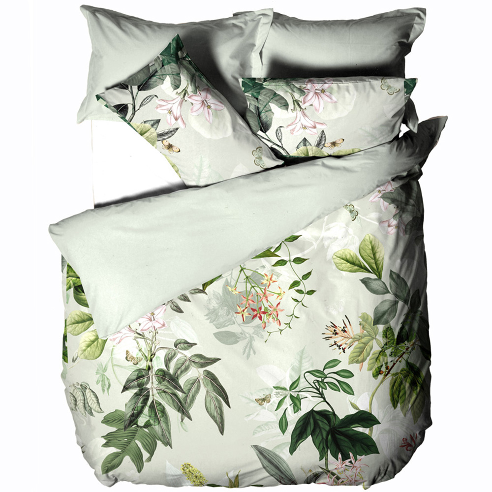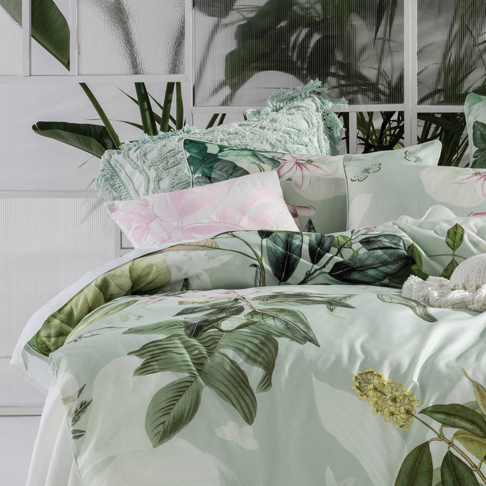 A contemporary mint-hued collage of lush tropical botanicals brings a calming atmosphere to your bedroom. The double duvet cover set features white cord piping for a refined touch. Crafted from soft cotton, this set includes matching pillowcases with convenient snap press stud closures. Effortlessly complementing diverse interior styles, this duvet cover set offers understated elegance.