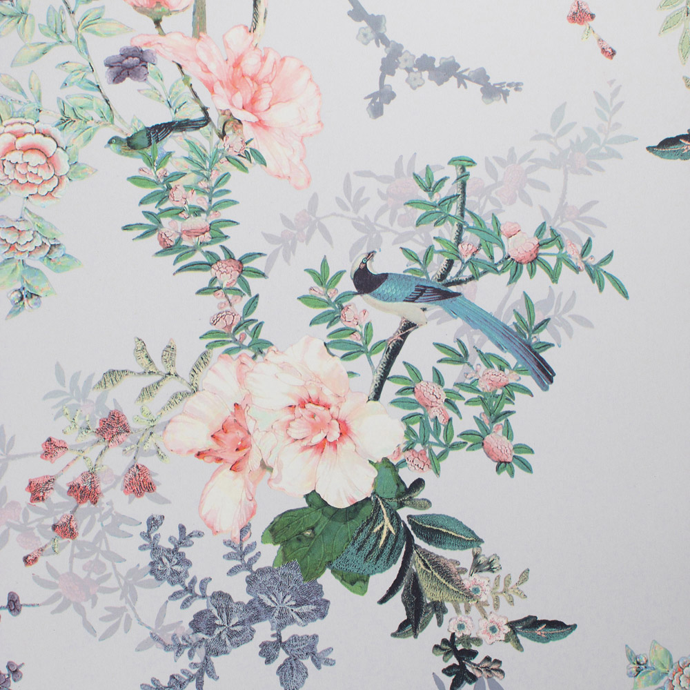 Transform your space with the Ophelia Wallpaper, a captivating blend of tropical and Chinoiserie styles. This fantastical oriental scene showcases cherry blossoms, birds of paradise, and delicate bamboo leaves in a soft, feminine grey palette. The fresh tones create a romantic atmosphere, perfect for brightening bedrooms, living rooms, or formal dining rooms. It's super easy to hang.