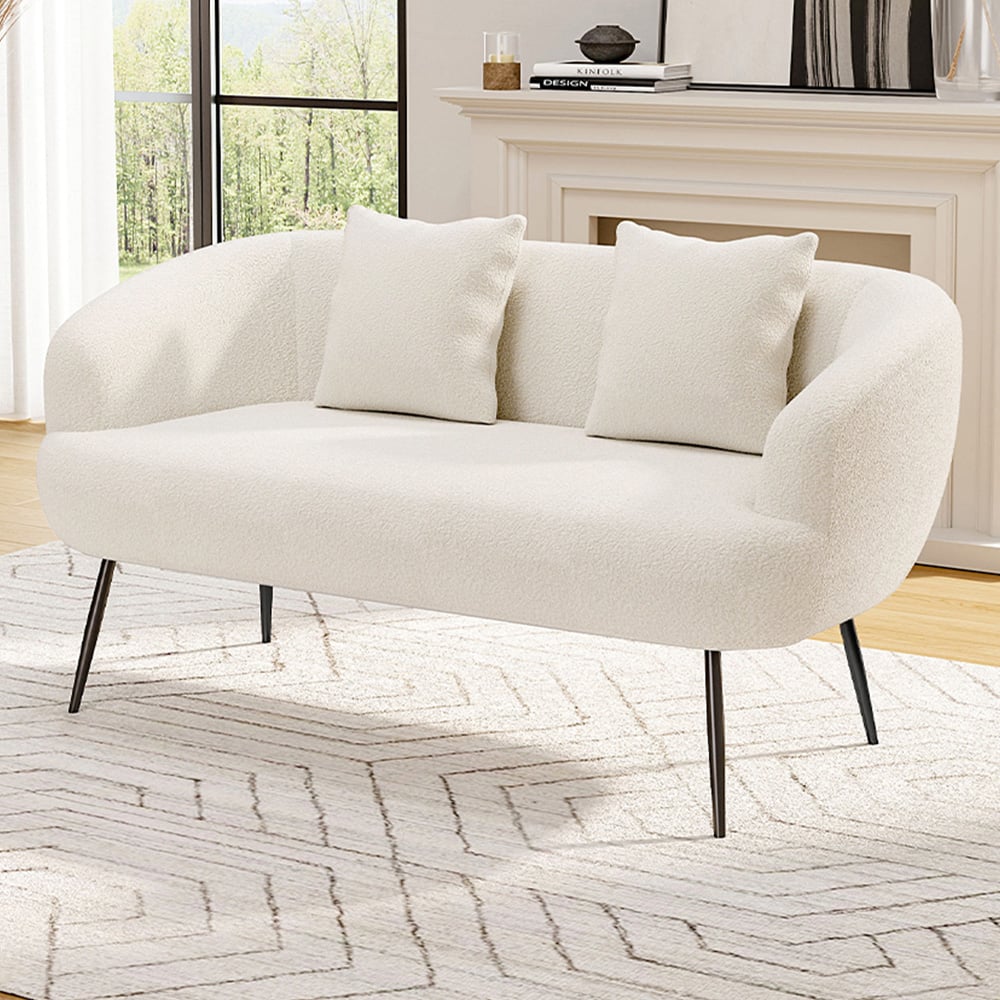 Wrap yourself in the cloud-like comfort of the Living and Home 2 Seater Teddy Fabric Loveseat, designed for both style and relaxation. Crafted with a solid wood frame, it features a soft, inviting silhouette with rounded arms and a firm, foam-filled back for a plush, overstuffed feel. Supported by four slim, tapered legs in sleek black metal, its modern design makes it a perfect fit for any living space.
