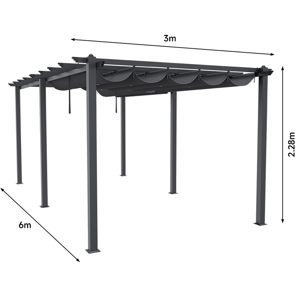 Extend your living space outdoors with this 3 x 6m aluminium patio deck pergola, perfect for dining, socialising or simply unwinding. Its water-resistant polyester canopy offers shelter from unexpected showers, allowing you to enjoy the fresh air without interruption. Featuring a contemporary design with streamlined frames and an open beam ceiling, this pergola is a stylish addition to any garden. Adjust the canopy effortlessly with its simple pull-string mechanism, tailoring the sunlight to your preference and ensuring tailored comfort. Constructed with robust yet lightweight aluminium posts, this pergola embodies enduring elegance and includes all necessary mounting hardware for a secure and stable build.