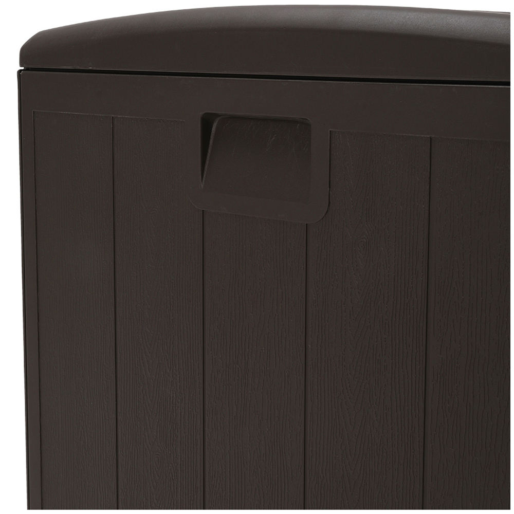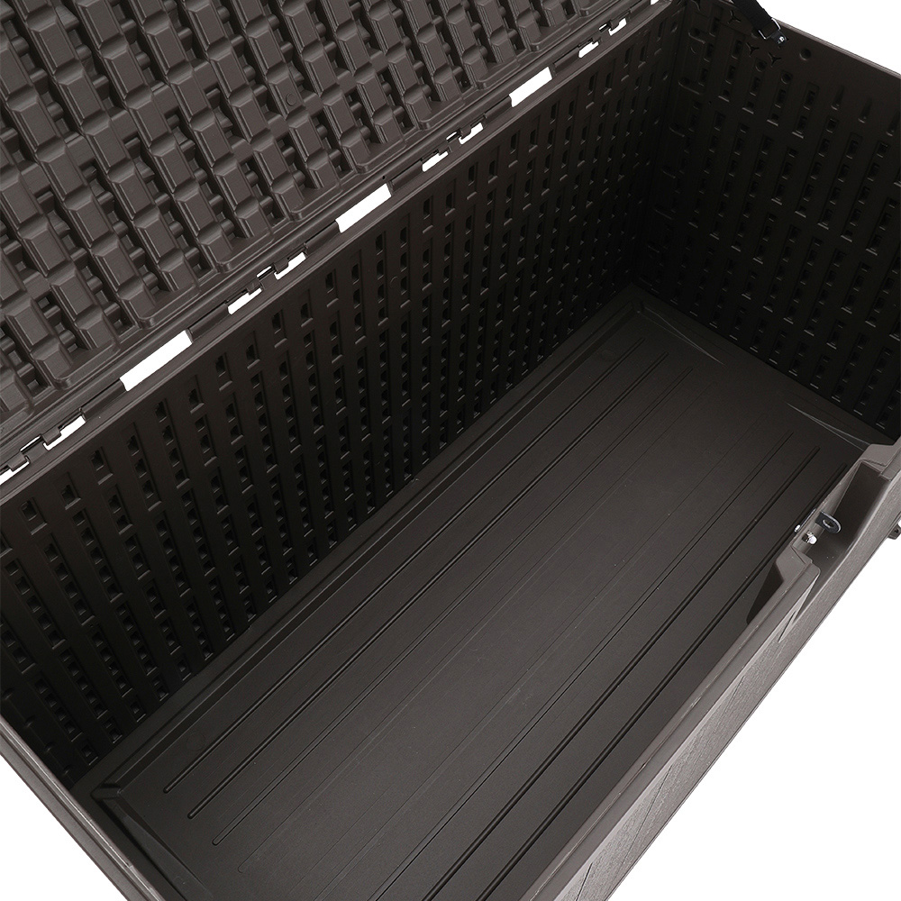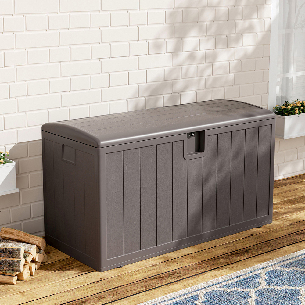 Organise your outdoor space seamlessly with the Living and home Waterproof Garden Storage Box, designed to eliminate clutter from your patio, garden, or deck. Boasting a chic rattan-style texture, this large storage box balances style with durability, integrating effortlessly into any outdoor environment. Constructed from high-density HDPE plastic, it features weatherproof, waterproof, and UV-resistant properties that protect your belongings from rain, snow, and dust. With a spacious 99-gallon capacity, it efficiently stores cushions, gardening tools, BBQ accessories, and more. The secure lockable lid ensures safety, while hidden side handles simplify moving the box as needed. Dimensions: H64 x W127 x D61cm.