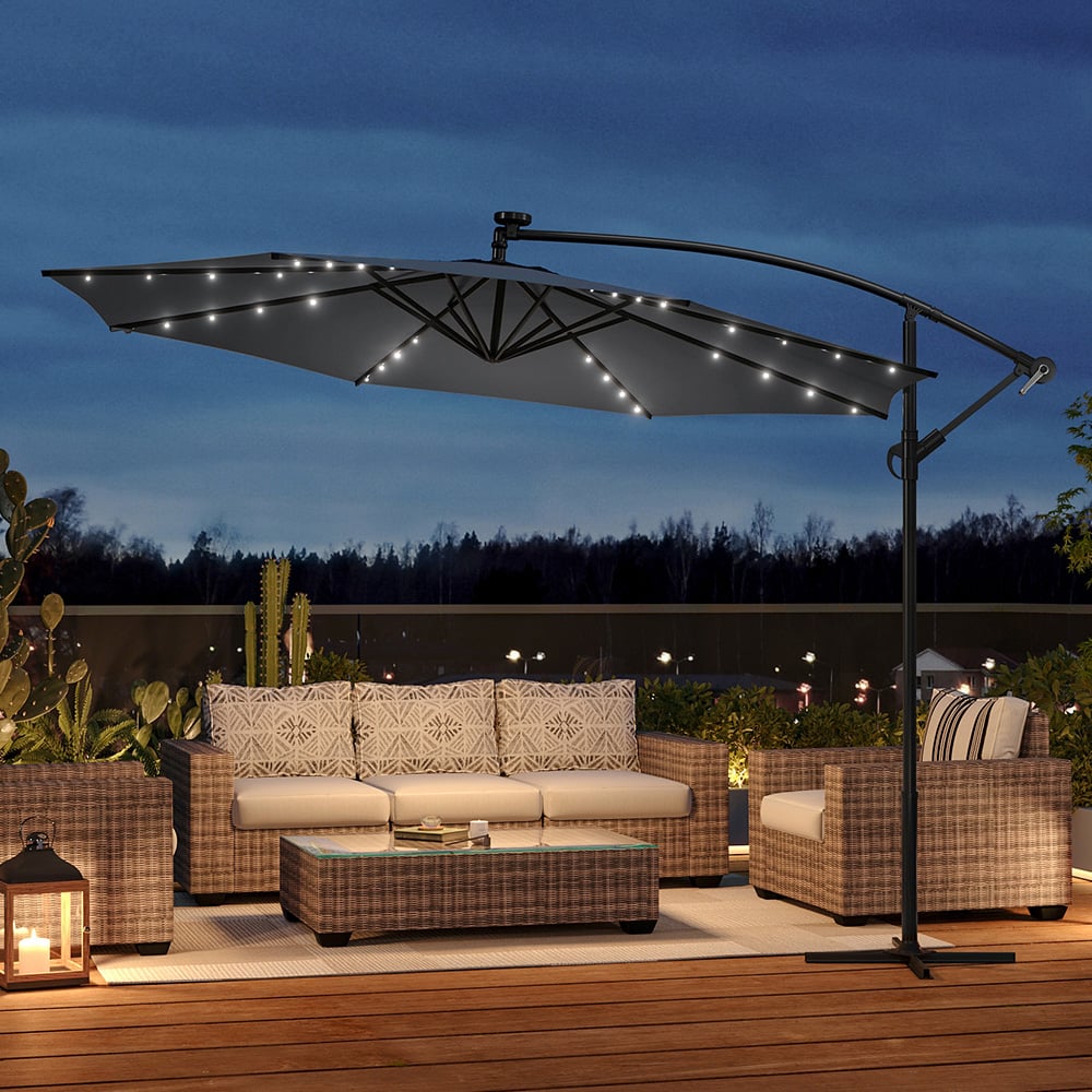 Relax in your gardens under the 3m Cantilever Parasol with Cross Base and Square Base. Sturdy and safe, this parasol is waterproof and UV-resistant, perfect for shelter when it rains and protects against UV rays. With a high-quality 180g polyester fabric with top vents and an optional base, this parasol makes a perfect addition to your garden areas. Easy to use, simply lift the slider to extend your parasol outward. Also, thanks to the three-metre diameter, this hanging garden parasol effortlessly hangs over your dining set or garden setting. The parasol perfectly complements your rattan furniture or outdoor dining table. For added convenience, it includes a crank winding mechanism to open and close the parasol without hassle. Plus, the inclination angle of the umbrella is adjustable for maximum ease. Material: 8 ribs, 48/42mm metal pole, 180g polyester fabric cover. Pole: 48 x 1mm. Base: 100 x 100cm. Size: 3 x 2.6m. Looking for a way to keep your parasol secure and protected and enjoy some shade? Check out our selection of parasol bases, designed to keep your parasol in place while you relax, and a parasol cover to keep them protected.