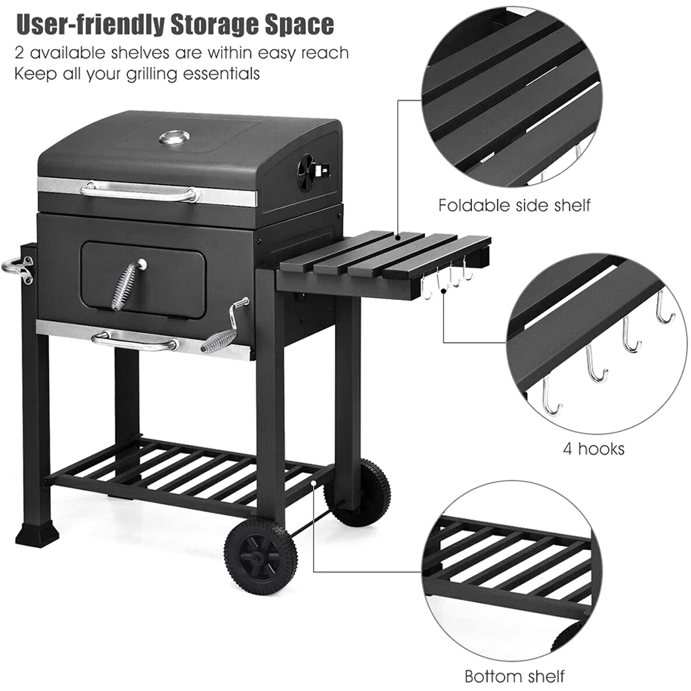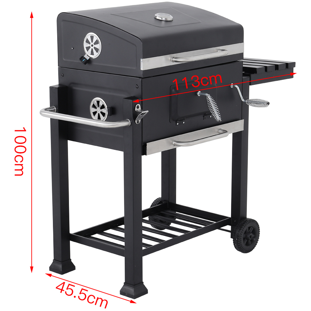 Transform your outdoor cooking game with this exceptional portable charcoal BBQ grill, perfect for backyard barbecues, patio parties, and camping adventures. It features a convenient pull-out ash drawer for quick cleanup, an adjustable charcoal rack to master heat control, and a built-in thermometer for precise temperature monitoring, guaranteeing flawless grilling results every time. The clever side air vent optimises airflow, enhancing flavour, while the wheeled design ensures effortless mobility. This robust charcoal BBQ pit is a must-have for grilling enthusiasts. With a lower shelf and side hooks for easy storage of utensils, along with a lid-mounted temperature gauge for effective heat management, this grill is built for both ease and durability. The two sturdy wheels make it easy to move around, and the pull-out ashtray simplifies cleanup. Constructed from heat-resistant galvanised metal, it promises long-lasting outdoor use.