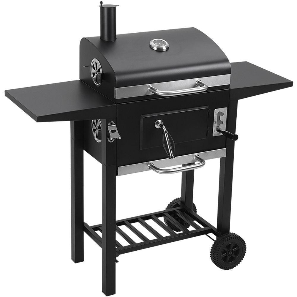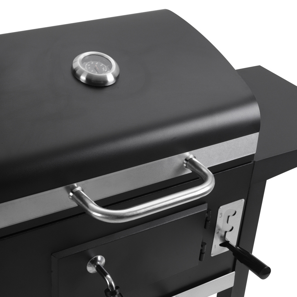 Enjoy effortless outdoor cooking with the Living and Home Black Charcoal Grill Trolley. This robust grill, built from premium carbon steel, guarantees lasting performance and exceptional results. The generously sized baking pan easily handles steaks, hot dogs, chicken skewers – whatever your barbecue craving. Precise temperature control is a breeze thanks to the built-in lid thermometer, ensuring perfectly cooked food every time. And with the cool-touch spring handle on the front door, adding charcoal is quick and easy.