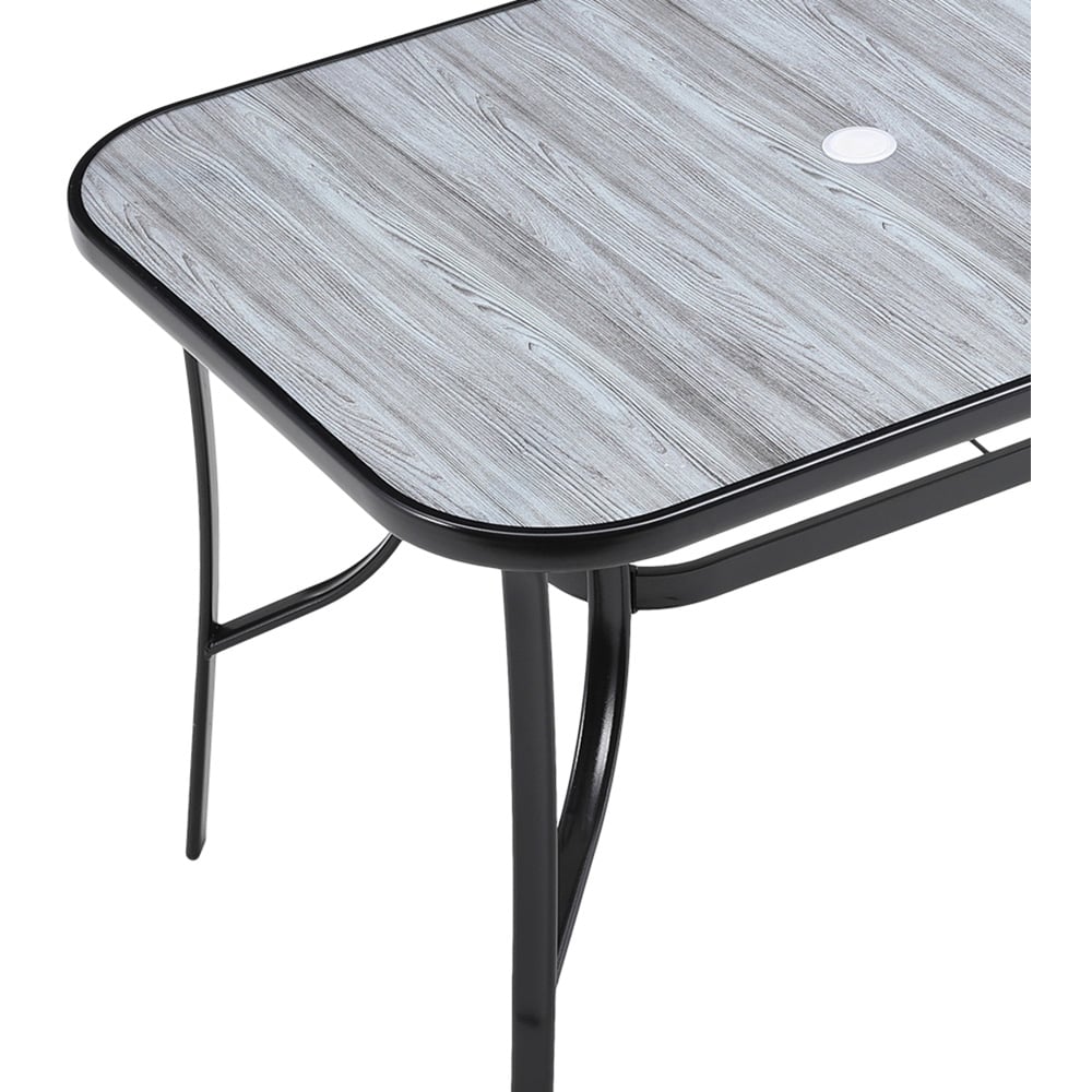 Elevate your outdoor area with this large rectangular coffee table, bringing indoor sophistication to your garden or patio. The robust tempered glass top offers a smooth, durable surface, complemented by a natural wood-grain effect underneath. A sleek black metal frame, subtly rounded to prevent knocks, encircles the glass. Conveniently, a parasol hole is incorporated for added sun and rain protection. The sturdy black base provides stability and a stylish finish. This statement piece measures a generous 120 x 80cm.