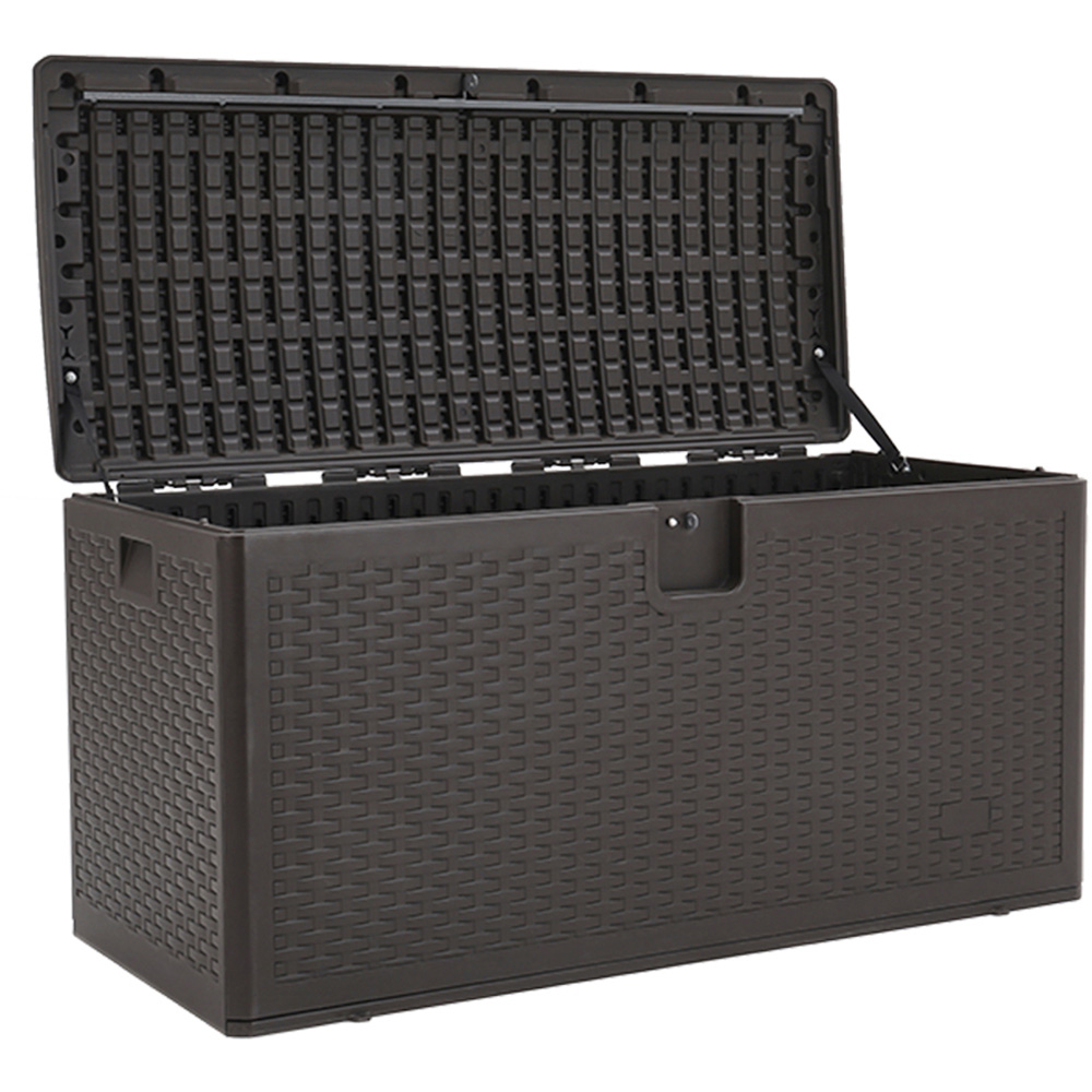 An elegant storage solution for your outdoor living space. This deck box, finished with a rattan-style texture, provides ample space for keeping pool equipment or patio essentials neatly stowed. Crafted from robust, waterproof HDPE, this durable plastic box protects against moisture and the elements, ensuring your items remain dry and secure. Its hinged lid offers effortless access, and the lockable design (lock not supplied) provides added peace of mind.