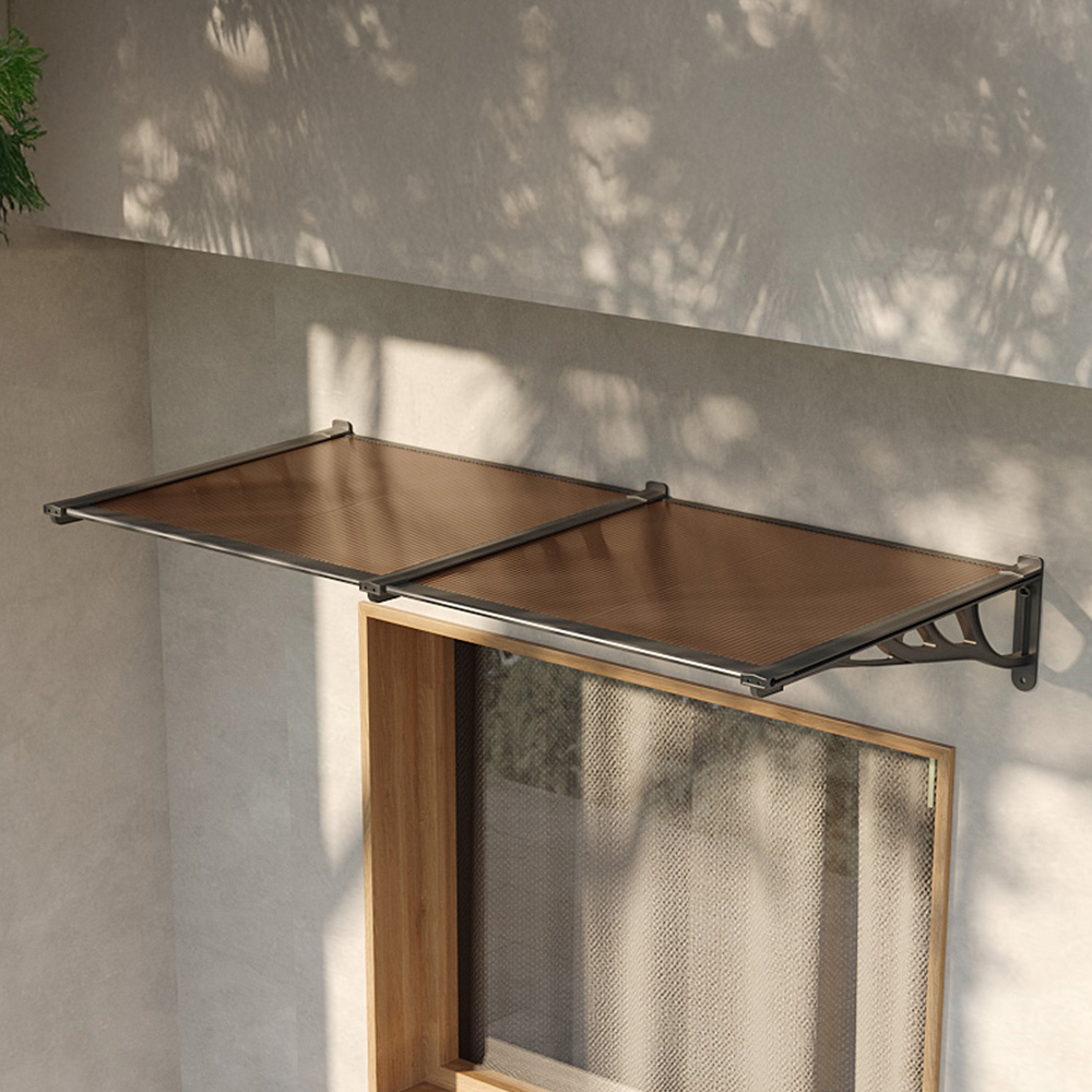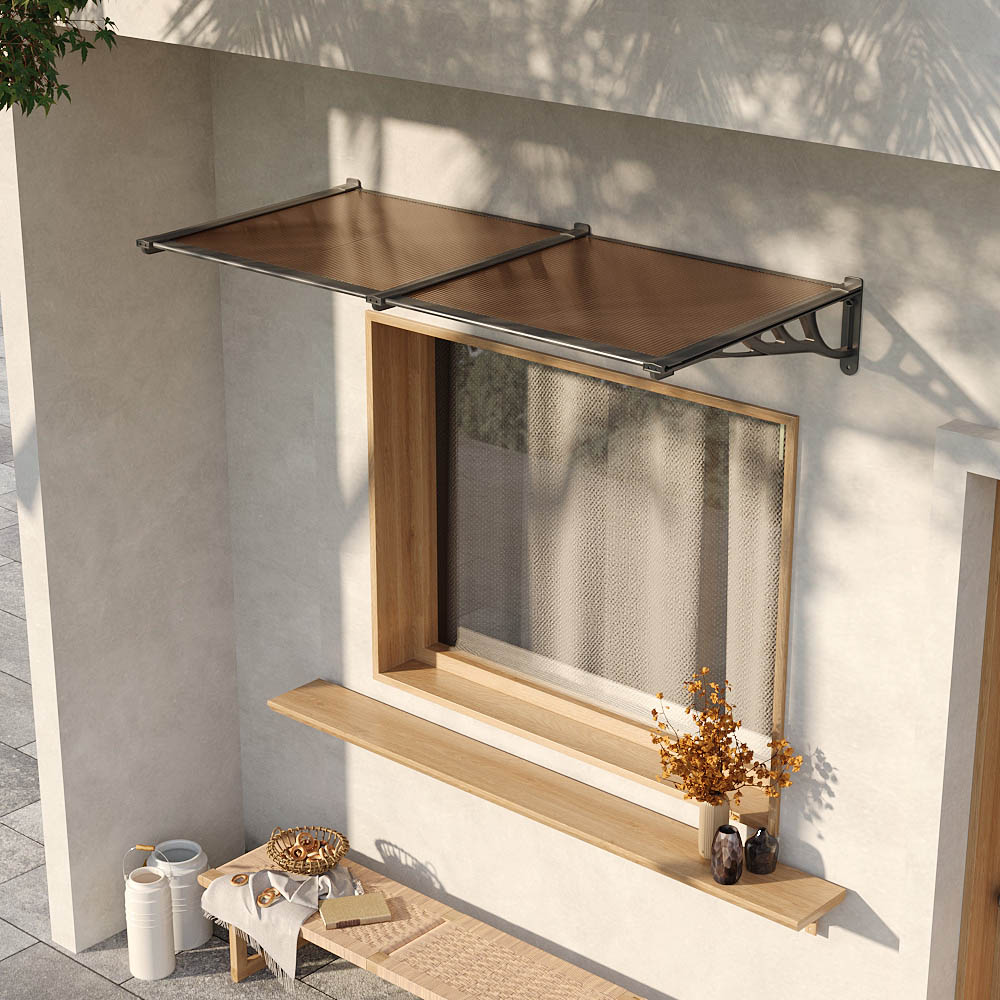 Transform your outdoor space with a sleek and practical Living and Home Dark Brown Flat Door and Window Awning Canopy 2 x 0.9m. This awning canopy features is suitable for installation above doors, windows, patios, and shopfronts, it supports up to 8kg per square metre. The structure allows for ventilation during light rain, enabling fresh air circulation without water ingress. It is a durable construction with high-strength plastic brackets and an aluminium alloy frame, offering reliable performance in various weather conditions. The sleek polycarbonate panel prevents the accumulation of rain and snow while contributing to a modern, streamlined appearance. Designed to provide UV protection, it helps shield entryways and windows from harsh sunlight. Multiple units can be connected for extended coverage, and all necessary fittings are included for quick, tool-free installation.