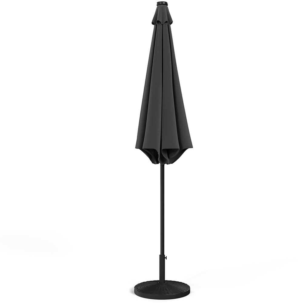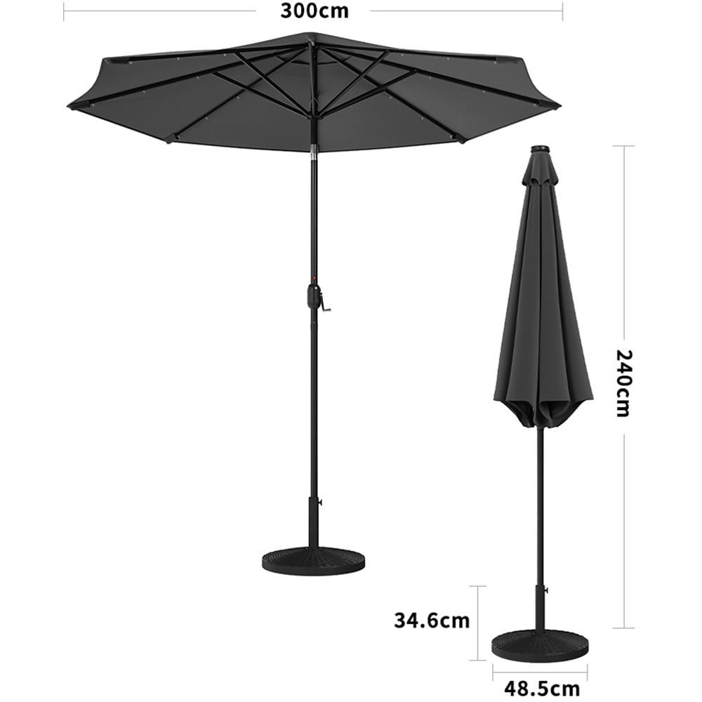 Enjoy your cuppa and evening meals on your patio under this 24 LED Garden Parasol Sun Umbrella from Living and Home. Featuring a large canopy that opens with a crank lift handle, this parasol provides proper shade. Made from high-quality polyester, the octagonal canopy in dark grey comes with eight ribs support and it works well with most outdoor settings. And when it starts to get dark, you can turn on the LED lights to add a romantic ambience. Powered by the solar panel at the top, there’s no need to worry about frequent charging. And, the included resin base can hold your parasol steadily no matter the weather. This umbrella is a wise choice if you want some shade and atmosphere at a time. Size: 3m.