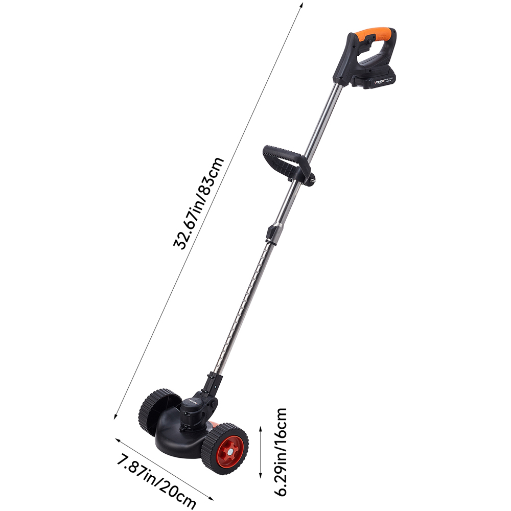 Mowing becomes effortless with this battery-powered lawn mower, designed for safety and adaptability. A robust steel wire frame at the cutting head allows blade angle adjustments from 0° to 90°, easily managing diverse terrains. The durable dual-wheel design ensures smooth operation across all surfaces, complemented by a height-adjustable assist handle for user comfort, regardless of height. Complete with two rechargeable batteries and a charger, it provides continuous mowing power for a perfectly manicured lawn.