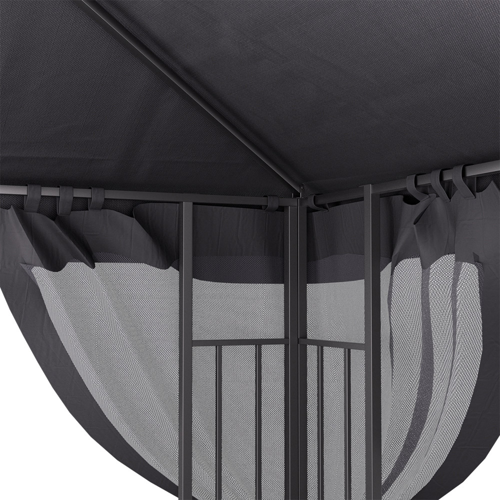 Shield yourself from the harsh summer sun with this essential garden gazebo. Designed to promote airflow with its vented top and light, airy curtains, you'll remain cool and comfortable even on the warmest days. Crafted with a durable, waterproof, and UV-resistant polyester canopy and supported by a robust metal frame, this gazebo is built to withstand diverse weather conditions, providing reliable protection for your outdoor furniture from UV rays and unexpected showers. Create a delightful and refreshing outdoor space for parties and gatherings with this superb gazebo.