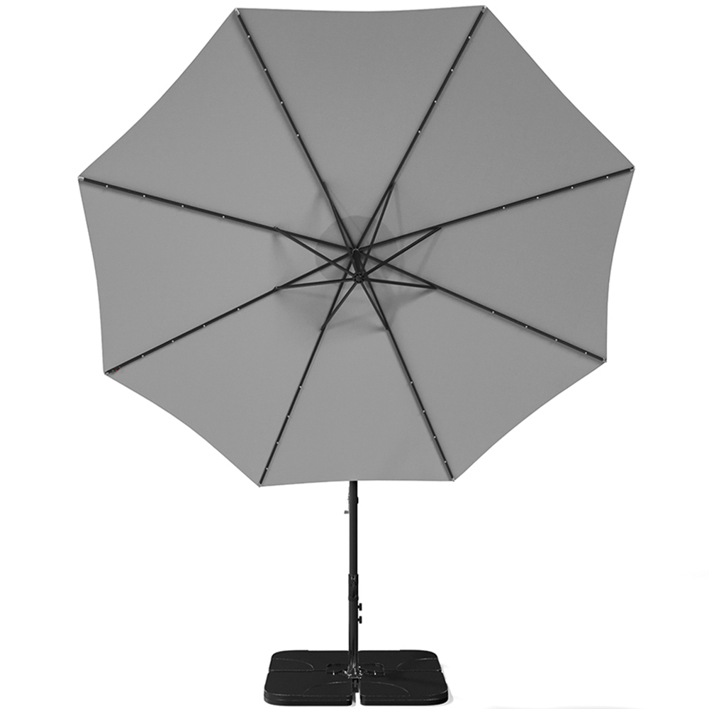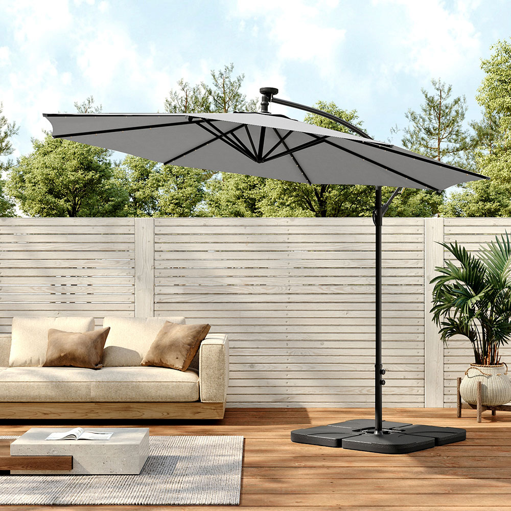 Enjoy your outdoor space, even after sunset, with the Grey LED Cantilever Parasol. Its octagonal canopy, crafted from durable, UV and weather-resistant polyester fabric, offers generous 3m shade, ideal for sheltering everything from garden sofas and bistro sets to outdoor dining furniture. Supported by eight sturdy ribs, the canopy also features 32 solar-powered LED spotlights, perfect for illuminating those long summer evenings. This overhanging parasol comes complete with both a cross base and a square base, ensuring stability and peace of mind. The smooth crank lift mechanism allows for effortless opening and closing, making it a practical and stylish addition to your outdoor living area.