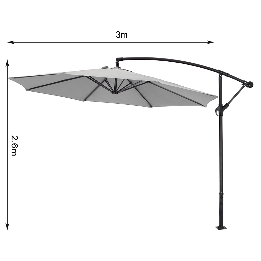 Enjoy enhanced outdoor relaxation with the Living and Home Light Grey 3m Parasol, complete with a crank and tilt mechanism, cross base and fillable base. This free-hanging parasol design ensures maximum comfort and convenience, free from intrusive poles. The adjustable tilt function allows customisation of the shade, enhancing your view, while the broad, UV-resistant canopy provides essential protection from the elements. A sturdy pole supports the parasol, complemented by two cross and fillable stable bases, ensuring resilience against challenging weather. Effortless opening and closing are guaranteed with the user-friendly crank mechanism, and its modern aesthetic introduces a decorative element to any outdoor setting.