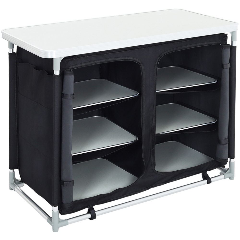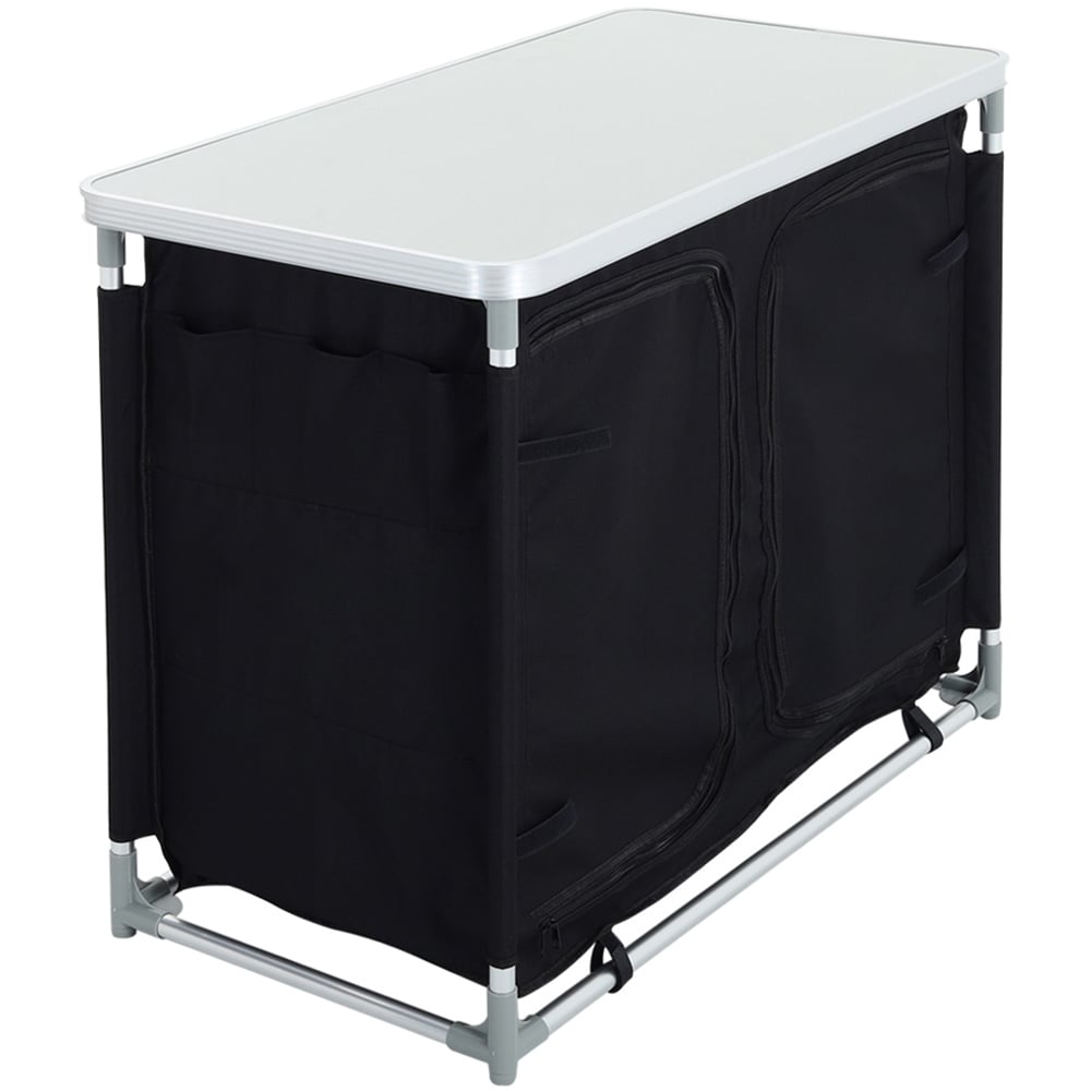 Discover the ultimate outdoor cooking companion with the Living and Home Portable Black Camping Kitchen Stand. This sturdy stand features a resilient aluminium frame that ensures your kitchen setup remains steady. A durable MDF tabletop provides a reliable surface for meal preparation, and the rounded corners prioritise safety for children. Enjoy ample storage space with the built-in zippered compartment for all your essential items. Plus, its lightweight design allows you to fold it up and transport it with ease.