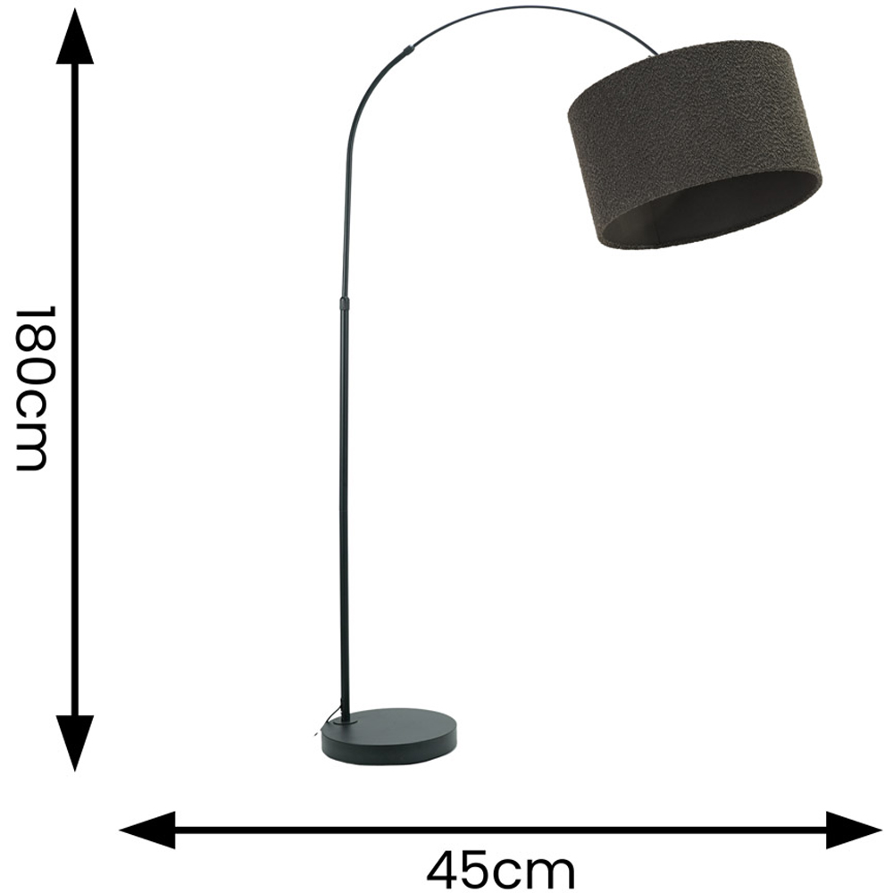 Elevate your living space with the Louis Charcoal Boucle Drum Shade Floor Lamp. This elegant arch lamp, perfect for reading or ambient lighting, casts a warm glow from its stylish charcoal boucle shade and slim black metal frame. It complements both classic and modern interiors, fitting seamlessly beside or behind sofas. Measuring 180cm high, 45cm wide, and 105cm deep, this lamp adds a touch of sophisticated vintage style to any room.