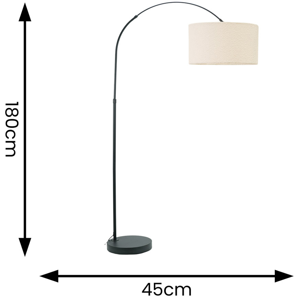 Elevate your living space with the Louis Cream Boucle Drum Shade Floor Lamp. This elegant arch lamp brings classic sophistication to any room, perfect for casting a warm glow over your favourite reading nook or nestled beside a sofa. Its slim black metal frame is beautifully topped with a cream boucle drum shade, creating a stylish and inviting ambiance. Measuring 180cm high, 45cm wide, and 105cm deep, this lamp is a statement piece designed to enhance both modern and traditional interiors.