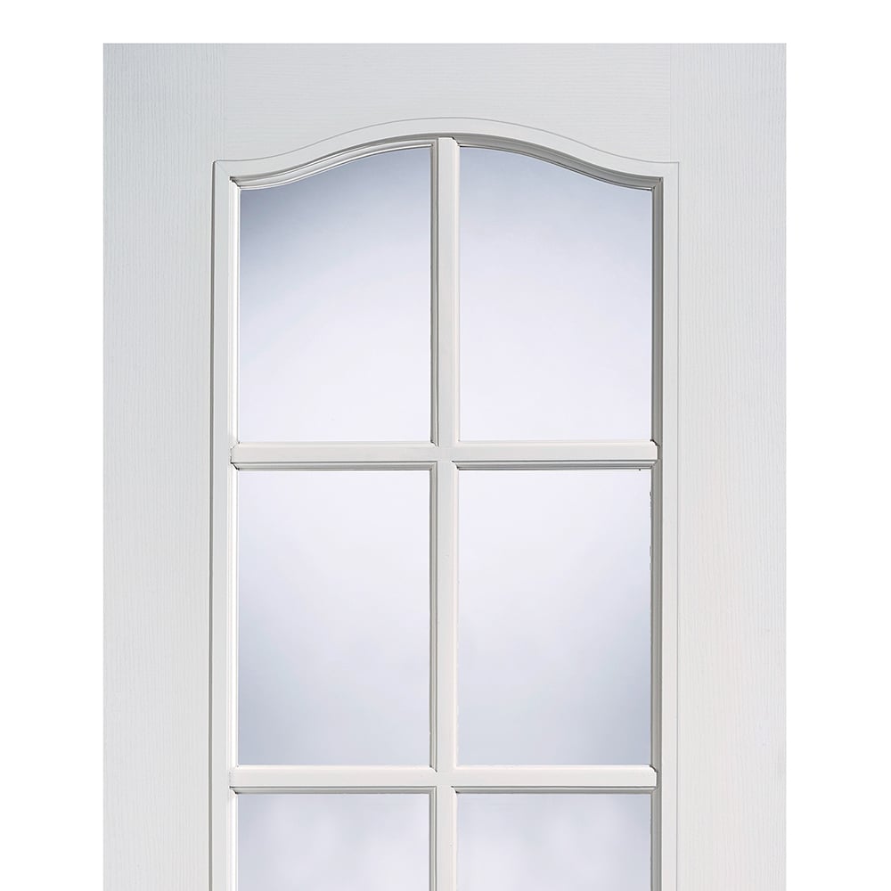 Enhance your home's interior with the Classic 1 Panel 6L Glazed Internal Door. This stylish door features clear glazed panels accented by decorative bars and a curved top edge, complemented by a raised shaped panel below. Crafted from white composite material, its design offers a distinctive and elegant touch. Measuring 1981 x 762 x 35mm, this door is a versatile addition to homes of various styles.