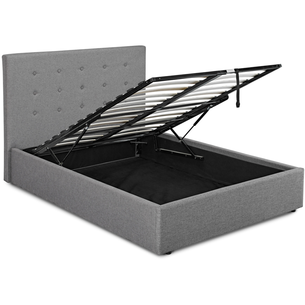 Offering comfort and style, the Lucca King Size Plus Bed is the ideal choice for a range of bedroom decors. Upholstered in a soft grey velvet fabric, this king size bed has a contemporary feel and the coordinating button detailing on the headboard gives it a chic finish. When space is at a premium, this versatile bed provides an impressive storage capacity simply by lifting the hydraulic-assisted mattress base. The classic linen-type upholstery ensures this bed frame fits seamlessly into both contemporary and vintage-themed spaces, making it a versatile choice for any home and offering a touch of luxury without breaking the bank, perfect for keeping your bedroom clutter-free.