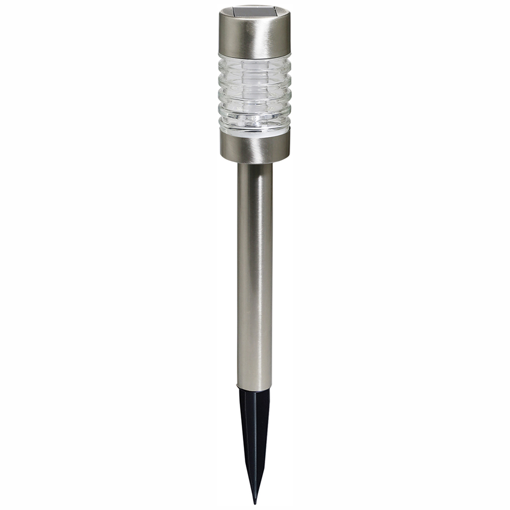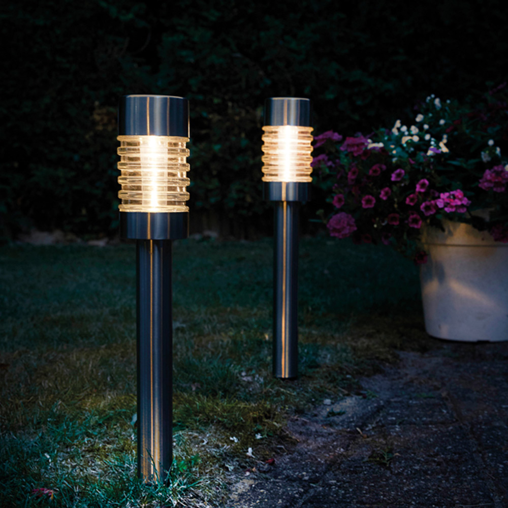Enhance your outdoor living spaces with these elegant solar-powered post lights. Their stylish design complements any garden, path, border, or driveway, providing ambient illumination. Constructed from durable stainless steel, these IP44-rated lights offer reliable performance and a sophisticated aesthetic. The integrated solar panel recharges the AA battery (included) during daylight hours, delivering up to six hours of light each night. Installation is quick and easy, simply insert the included spike into the ground. These lights boast an intelligent energy management system, guaranteeing six hours of light every night, all year round. Part of the Luxforms All Year Round range, these energy-saving LED lights offer a cost-effective and convenient solution for outdoor lighting, eliminating the need for complex wiring.