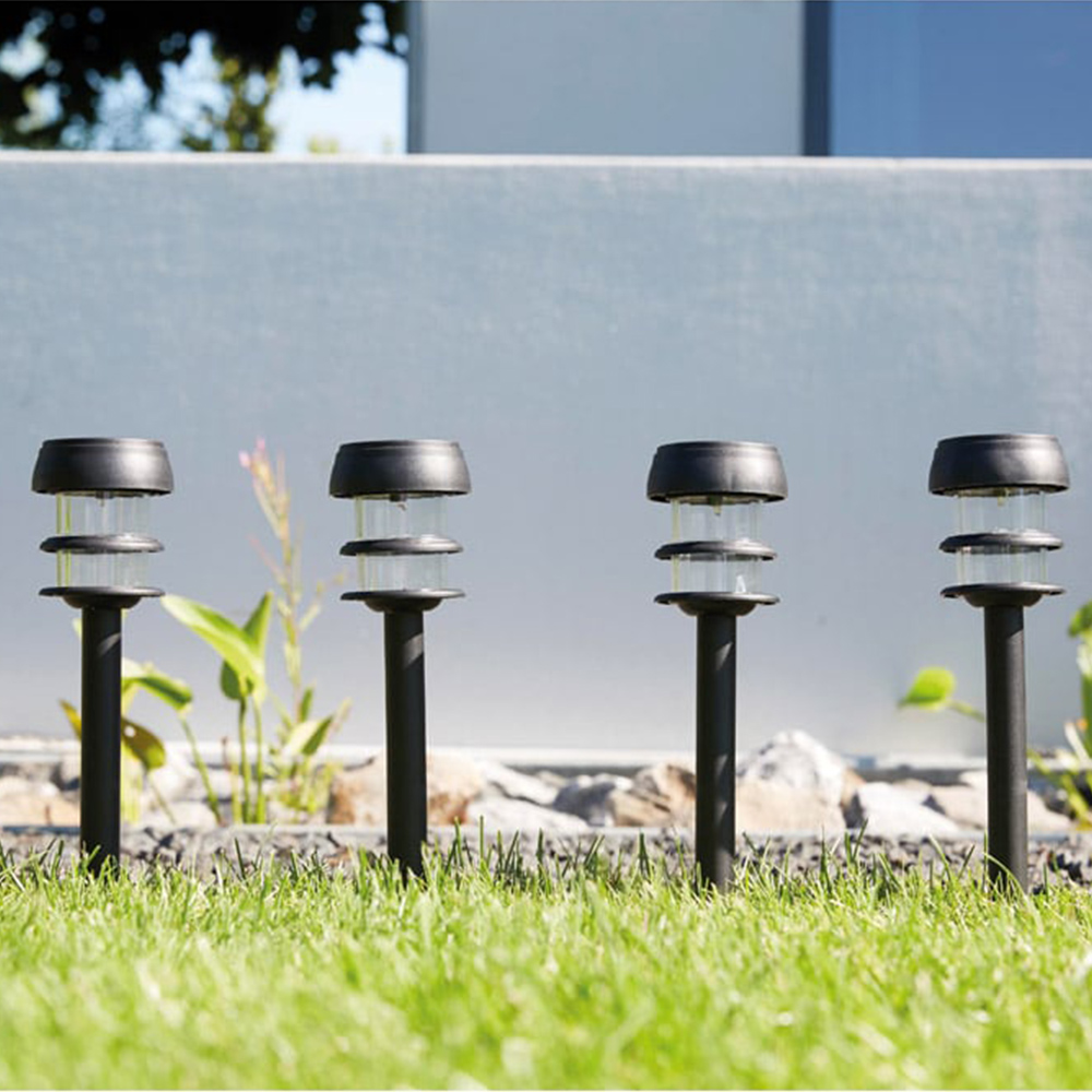 Enhance your outdoor spaces with the Lagos Black LED Solar Spike Lights. These stylish lights effortlessly illuminate gardens, driveways, paths, terraces, and porches, adding ambience and security to even the most remote areas. Crafted from durable plastic, each light features an integrated solar panel and on/off switch, harnessing free solar energy to power up to eight hours of illumination after a full day',s charge. The lights automatically activate at dusk and switch off at dawn, providing convenient, energy-saving lighting. Simple to install – just push the supplied spike into the ground – no wiring needed. This pack contains 24 lights, each with an IP44 rating for weather resistance. The lights use an AA battery.