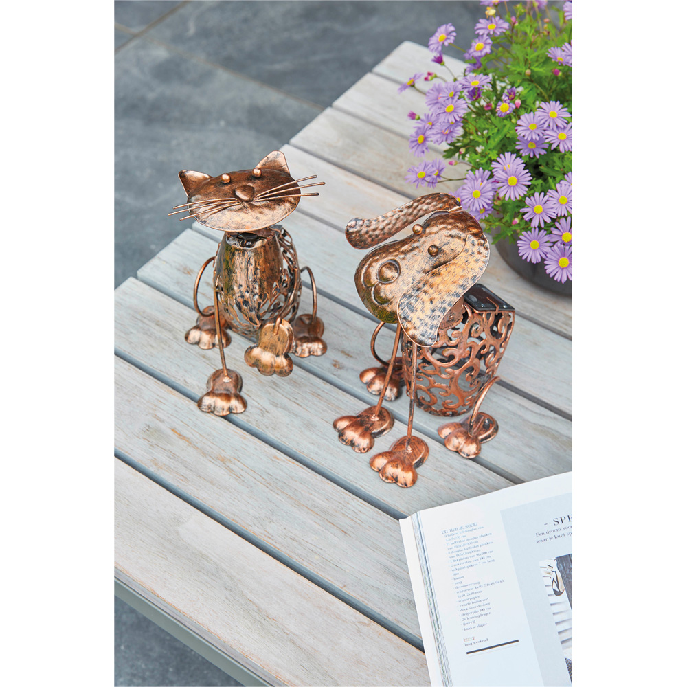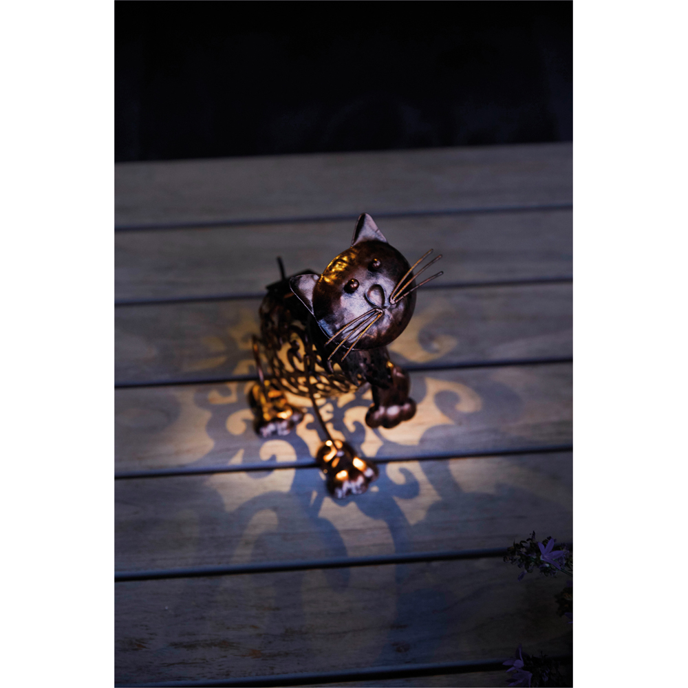 Illuminate your garden with the elegant charm of this solar-powered metal cat LED light. Perfectly positioned anywhere the sun shines, this wire-free design offers a touch of ambient light for lawns and patios alike. Its integrated solar panel cleverly harnesses the sun',s energy throughout the day, charging the AA battery for up to six hours of illumination. Enjoy automatic dusk-till-dawn operation, adding a welcoming glow as evening approaches. Rated IP44 for dependable weather resistance, this delightful light includes a single atmospheric softone LED for a warm, inviting ambiance.