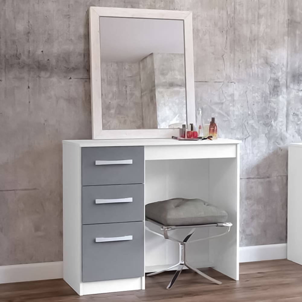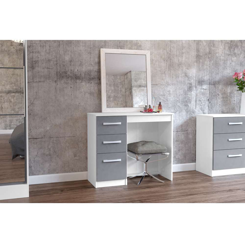 Introducing the Lynx dressing table: a sleek, stylish addition to any modern home. Its high-gloss white finish and bold silver accents create a contemporary look. The sturdy top panel supports up to 15kg, while each of the three spacious drawers holds 3kg. A perfect blend of form and function for the modern setting.