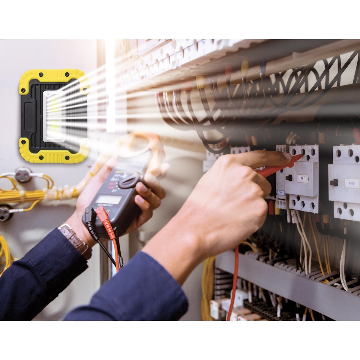 This portable cordless LED work light boasts a magnetic base and a built-in ratcheting stand for versatile use. Its lightweight design and multiple setup options—horizontal, vertical, and torch—provide all-around illumination. Ideal for workshops, vehicle repairs, DIY projects, and camping, this lamp keeps your hands free.