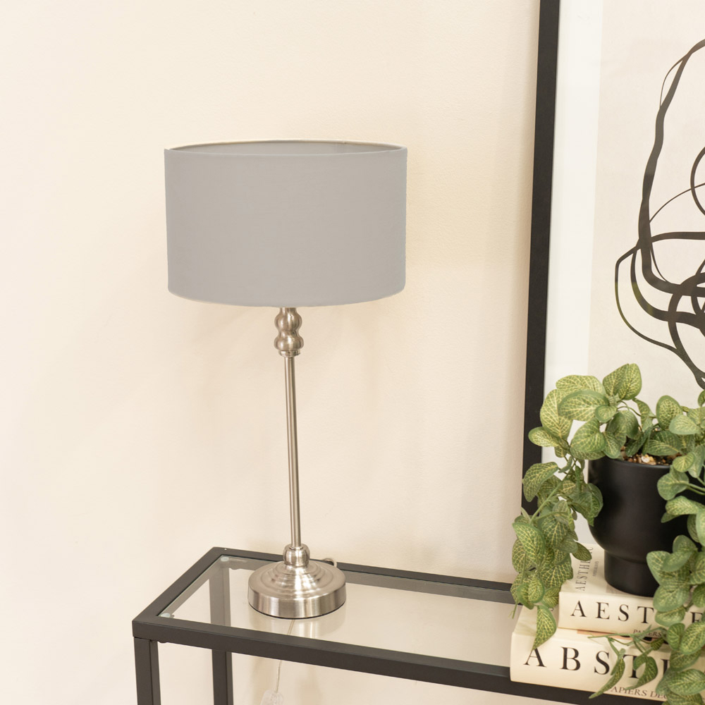 ValueLights Maggie Grey and Brushed Chrome Drum Shade Candlestick LED Table Lamp