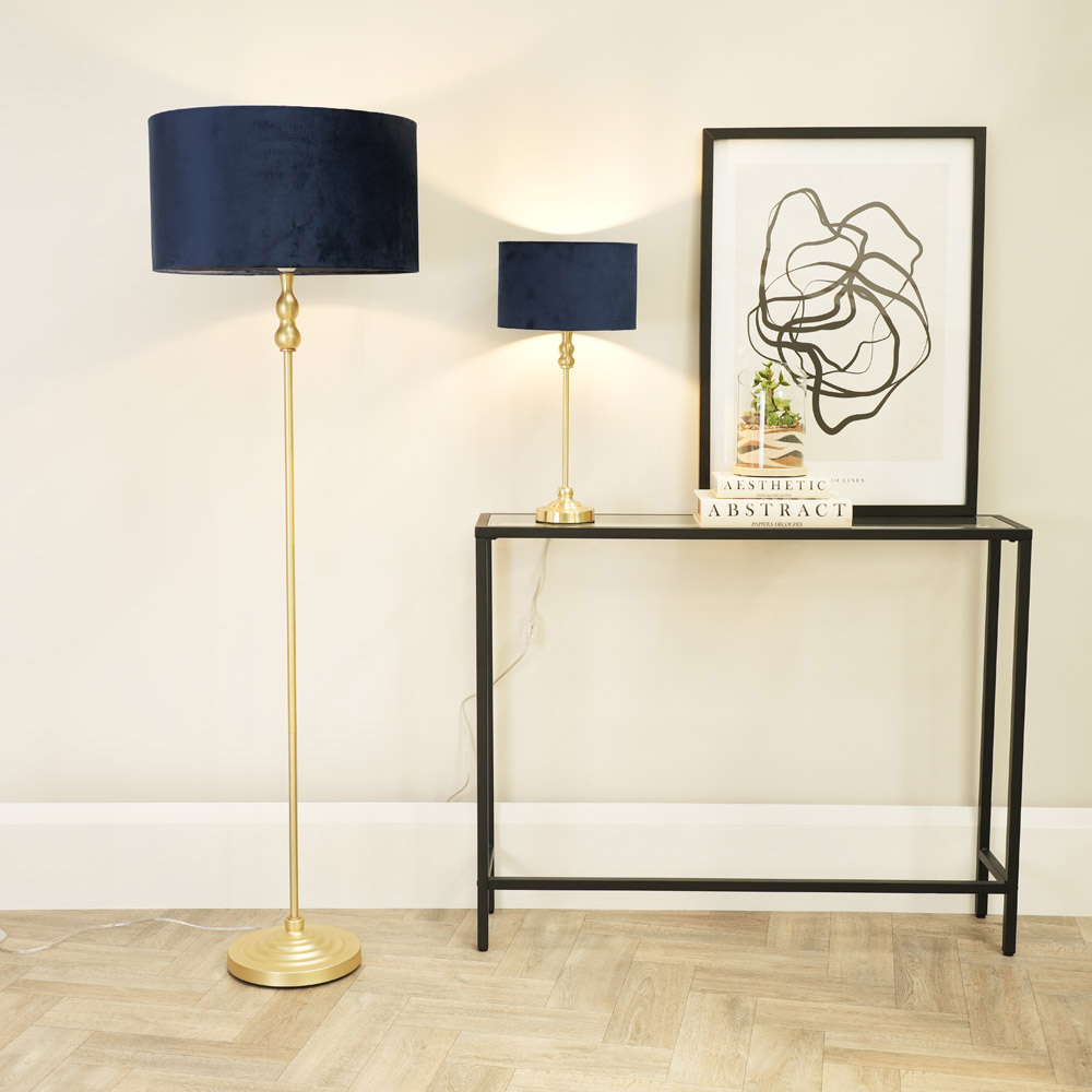 ValueLights Maggie Navy Blue Velvet and Gold Drum Shade Candlestick LED Floor Lamp