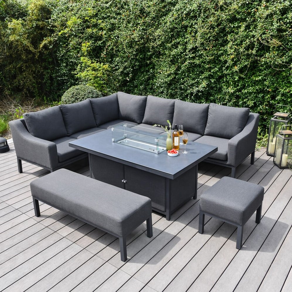 - Includes: 1 x Firepit Table, 2 x Sofas, 1 x Bench. 1 x Stool, 1 x Furniture Cover