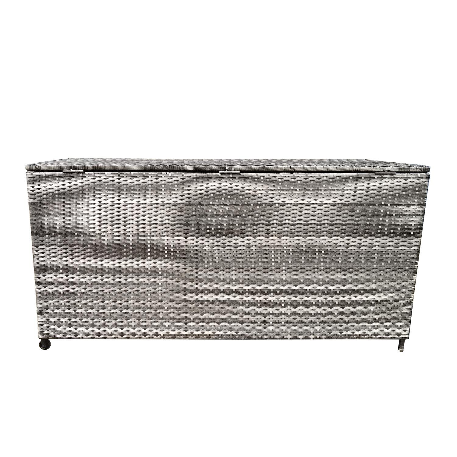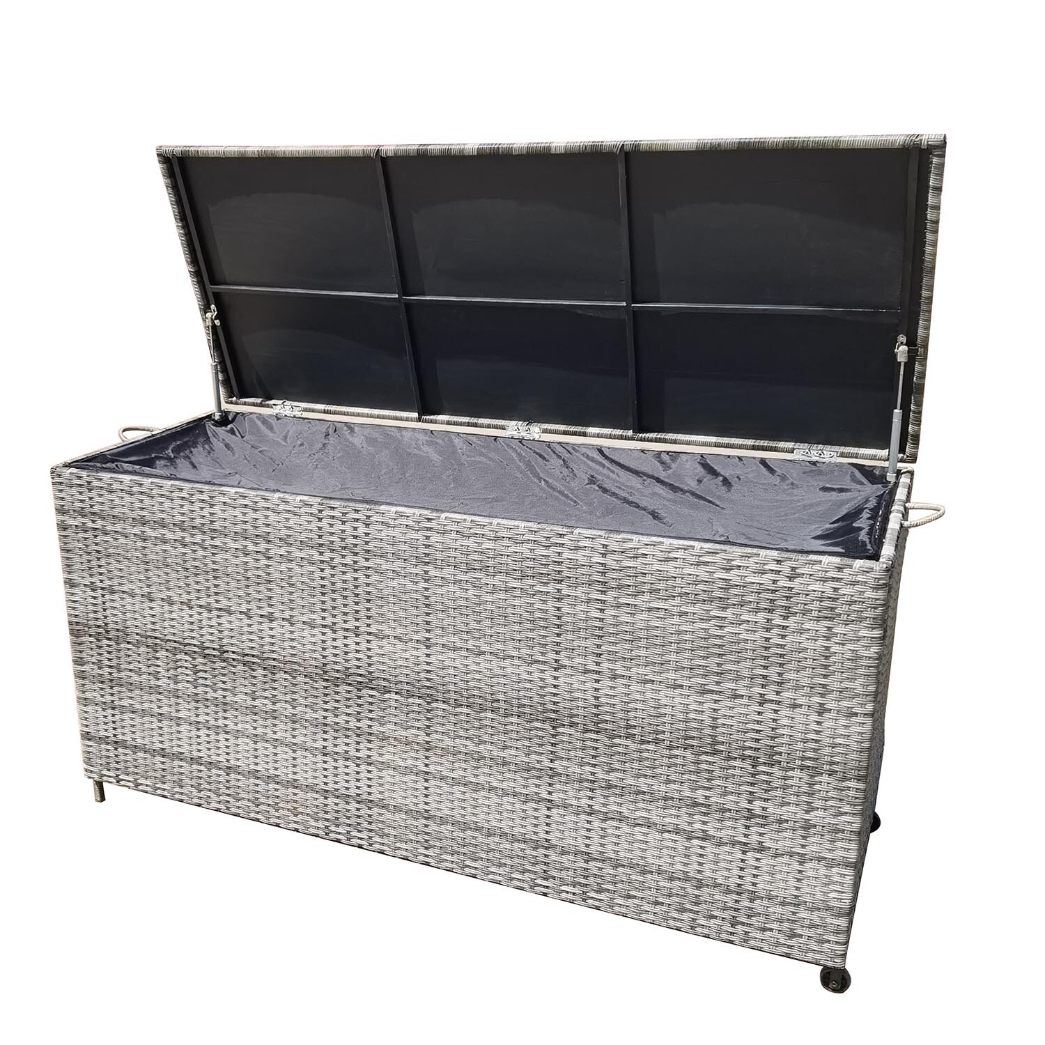 Elevate your home's style with the Malay Deluxe New Hampshire Grey Rattan Effect Cushion Box. Sleek and beautiful, this cushion box boasts a rattan style design in a natural hue to add a touch of charm to your interiors. It's easy to open and close and features rolling wheels to move it around effortlessly. The spacious inside offers ample area to pack away cushions and other items, making it a great addition to any garden.