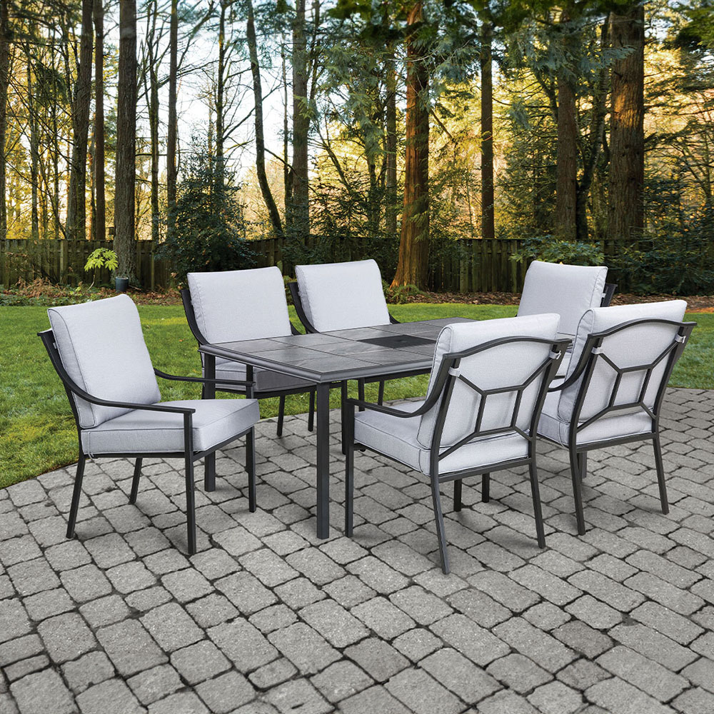 The Monte Carlo 7 Piece Dining Set combines understated style with exceptional comfort, bringing a sophisticated al fresco dining experience to your home. The table features tiles with a luxurious stone-effect design in grey, accented by a black tile in the center for added depth and interest. The soft grey cushions are plush and incredibly comfortable, perfectly complementing the sleek black frame. Each chair showcases an attractive design on the backrests, while the elegant curves of the armrests and bold legs enhance the set's sophisticated look. With six chairs included, this set is perfect for large families or anyone who loves hosting friends for long summer evenings. Made from weather-resistant materials, the Monte Carlo set ensures you can enjoy meals and relaxation outdoors for years to come.