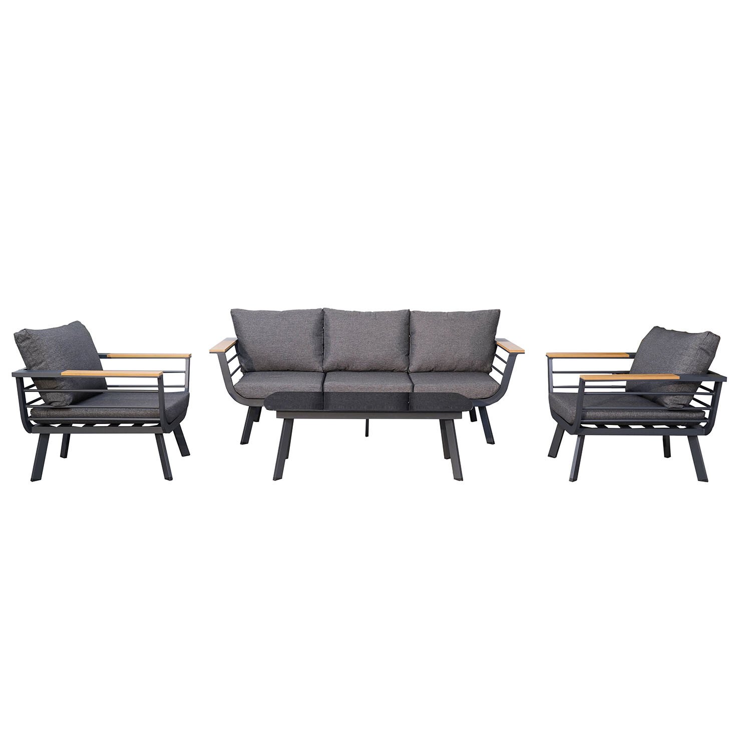 - Includes 1 3-seater-sofa, 2 chairs, and 1 table