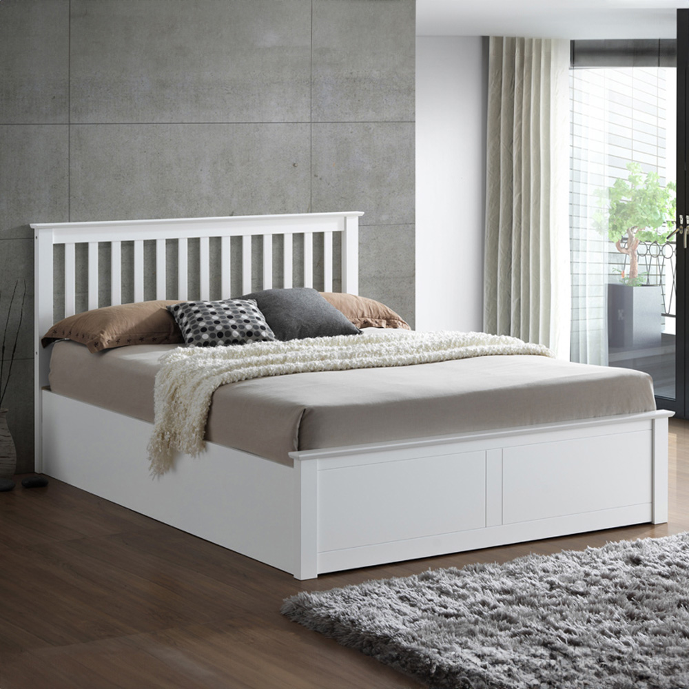 Upgrade your bedroom with the Malmo double bed, a stylish and practical addition to any home. Its elegant white wooden frame, featuring a 42cm slatted headboard and low foot end, fits seamlessly into various interior styles. Effortlessly access the generous under-bed storage, cleverly concealed and split into three sections, perfect for keeping bedding or extra items neatly stored. The 27cm deep storage is fully boarded, ensuring contents remain off the floor. Crafted from durable rubberwood, this sturdy bed boasts a sprung slatted base for added comfort and bounce. Delivered flat-packed for easy transport and self-assembly.