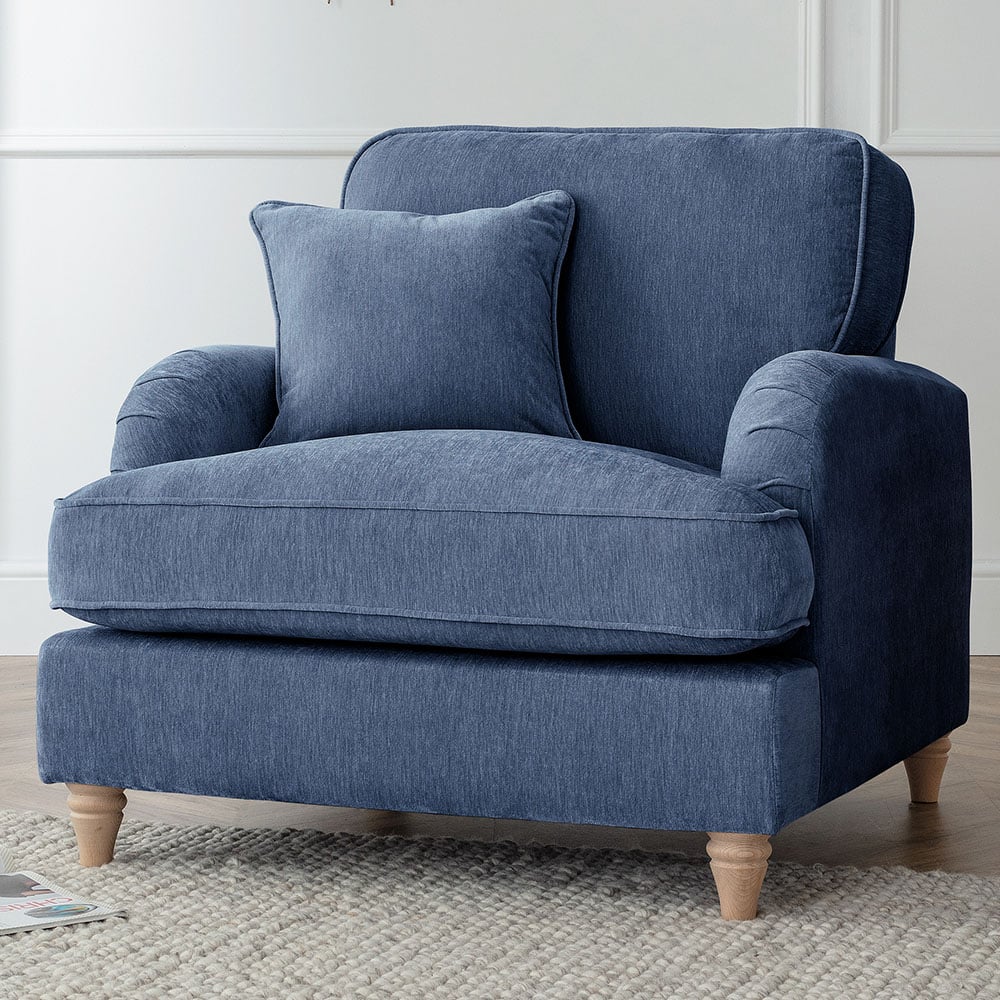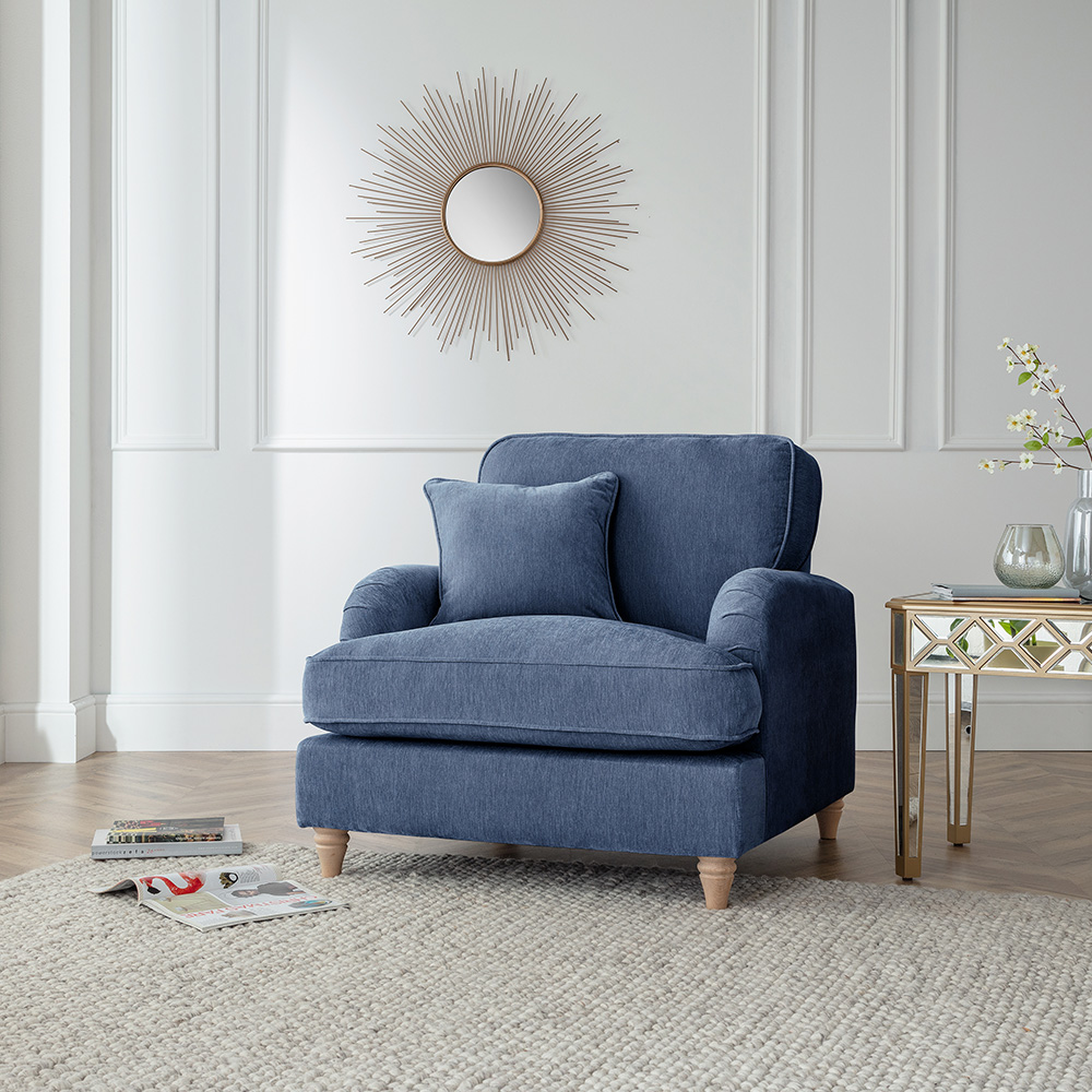 Make a statement with the Manhattan Navy armchair! This timeless design gets a modern update, perfect for adding a touch of sophisticated style to your home. Upholstered in luxurious, textured Manhattan fabric in a vibrant navy hue, it effortlessly complements any décor. Sink into the deep, plush seat—pocket sprung and layered with high-density foam for exceptional comfort. The generously filled polyester fibre back cushions will need occasional plumping to maintain their shape. Featuring tailored pleat arms and modern pale wood legs, this handcrafted chair even includes convenient in-room delivery and packaging removal. Removable covers allow for professional cleaning.