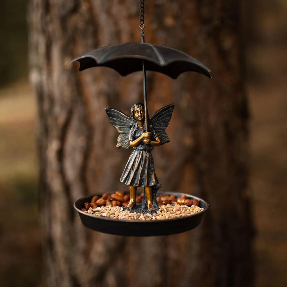 Bring a touch of magic to your garden with this charming fairy bird feeder. A delightful resin fairy, sheltered under her umbrella, sits at the heart of this feeder, providing a whimsical focal point. Ample space around her base allows for generous helpings of seeds and feed, while a convenient perch ensures feathered friends feel welcome. The feeder boasts a sturdy metal construction with a beautiful brushed bronze finish, offering both durability and a touch of traditional elegance. A strong metal chain and hanging hook make it simple to suspend from trees, bushes, or even fences. Lightweight yet weatherproof, this unique feeder is as practical as it is attractive – a perfect gift, or a lovely addition to your own garden.