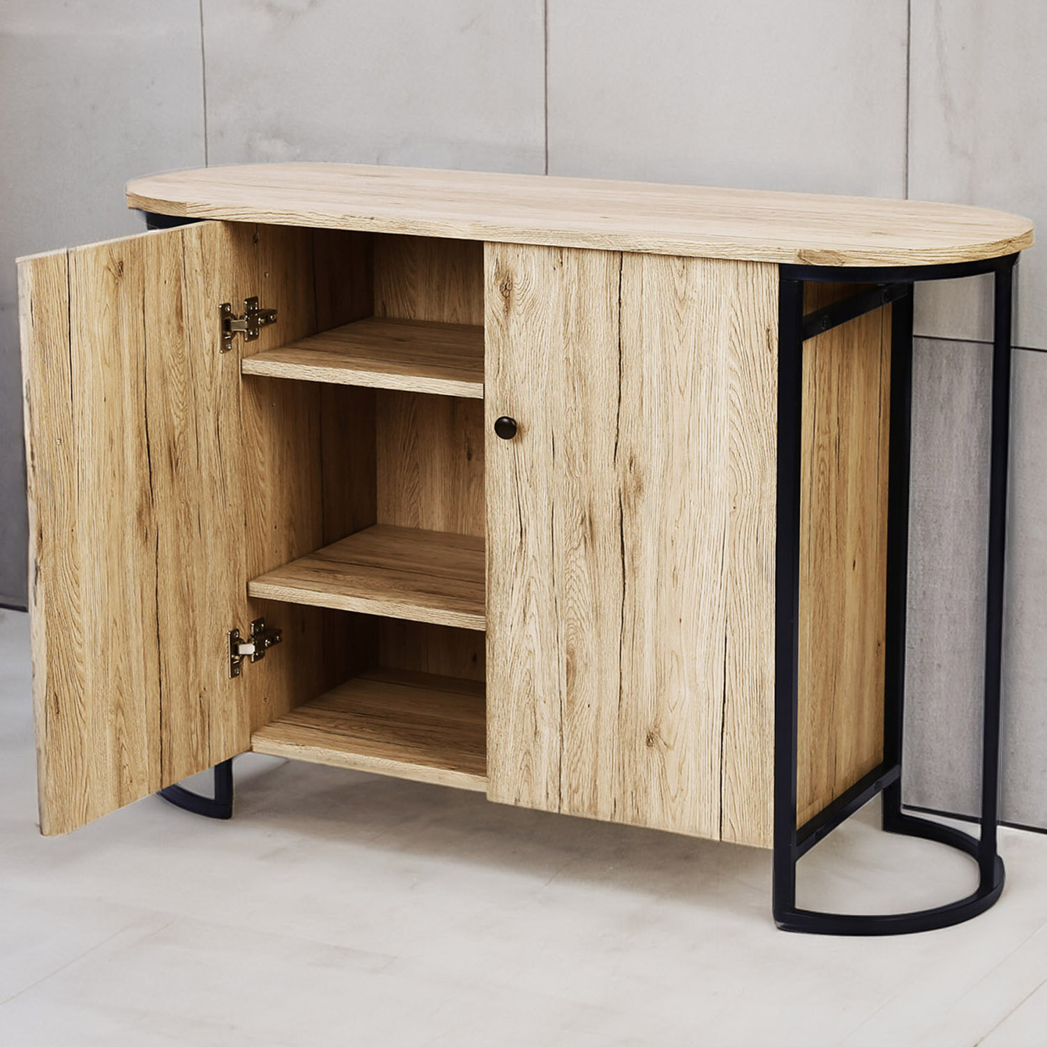 The Marseille Sideboard offers an industrial-inspired design, modernised with curved edges and a sleek, black powder-coated metal frame. The wood-effect cabinet opens to provide ample storage space behind its doors, revealing two internal shelves perfect for stowing away all sorts of miscellaneous items. Ideal for your living room or hallway, this unit provides both style and practicality. As part of a matching furniture collection, you can coordinate your space with matching shelving units and a TV stand, all available separately, to complete the look.