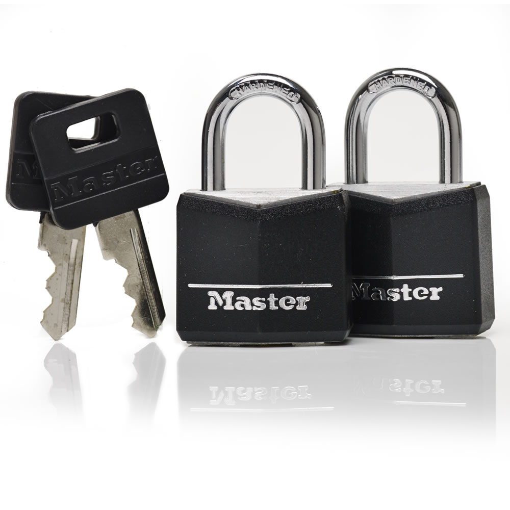 Double the security, double the peace of mind. This two-pack of Master Lock 30mm vinyl-covered aluminium padlocks provides reliable protection for your belongings, indoors or out. The durable black vinyl coating resists scratches and corrosion, while the hardened steel shackle, 4-pin cylinder, and dual locking levers offer superior resistance to picking and prying. Each padlock boasts a 30mm wide body and a 5mm diameter shackle (18mm long), making them suitable for various applications, from lockers and cabinets to toolboxes and more. Your purchase includes two padlocks, two keys, and a limited lifetime warranty against mechanical failure.
