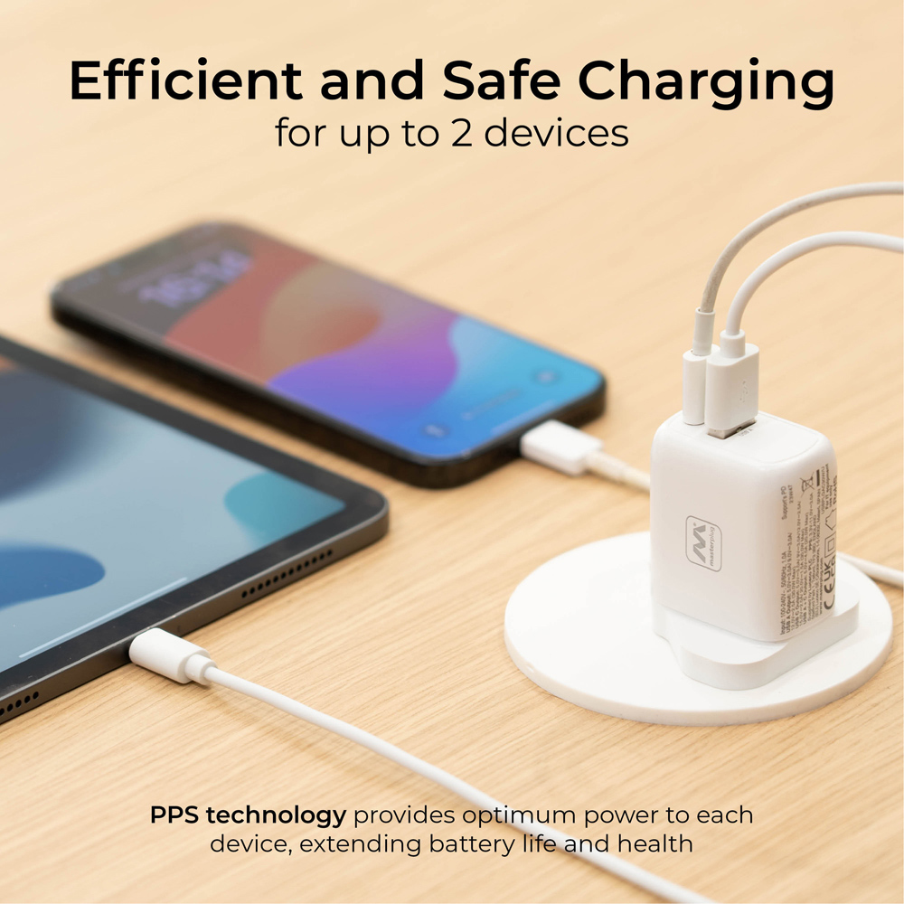 Charge up to three devices at once with the Masterplug 30W White USB Charger. This triple-port charger features both USB-A and USB-C ports, ensuring compatibility with your devices. Safe and efficient charging is guaranteed by advanced PPS technology, optimizing power delivery for extended battery life. Enjoy fast charging speeds with support for PD 3.0 and QC 4.0.