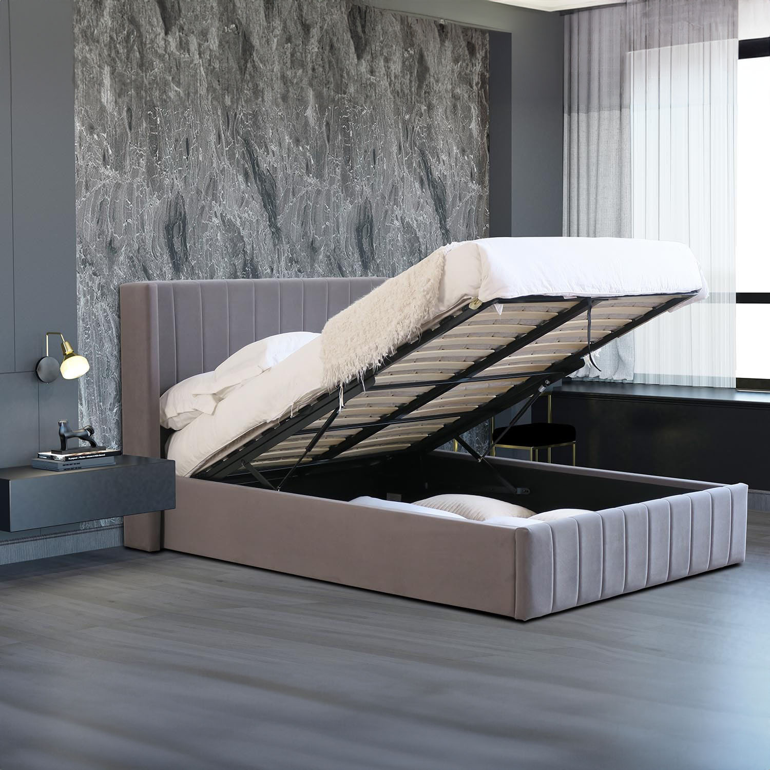 Add a touch of understated elegance to your bedroom with the Maya Ottoman Storage Bed Frame. This super king-size bed boasts a sophisticated grey velvet finish on both the headboard and base, complementing any existing décor. The cleverly concealed ottoman storage provides ample space for bedding or seasonal clothing, keeping your bedroom clutter-free. The high headboard adds a touch of grandeur, perfect for a master bedroom suite. Crafted from durable yet affordable hardwood, metal, and plywood, this bed frame offers high-quality style without the high price tag. Simple to assemble, you'll be enjoying restful nights in no time. Dimensions: H112 x W207.5 x D218cm. Weight: 66kg. Weight capacity: 200kg. Mattress not included. Assembly required.