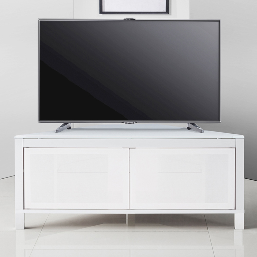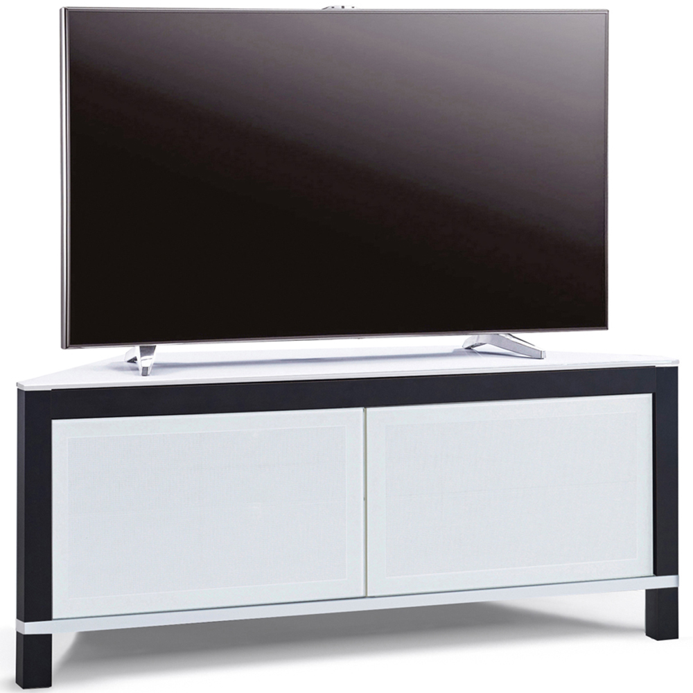 A space-saving corner cabinet, the Volans boasts sleek lines and remote-friendly doors with integrated cable management. Its adjustable glass shelving provides ample storage, while reversible trims offer a choice of black or gloss white finishes.