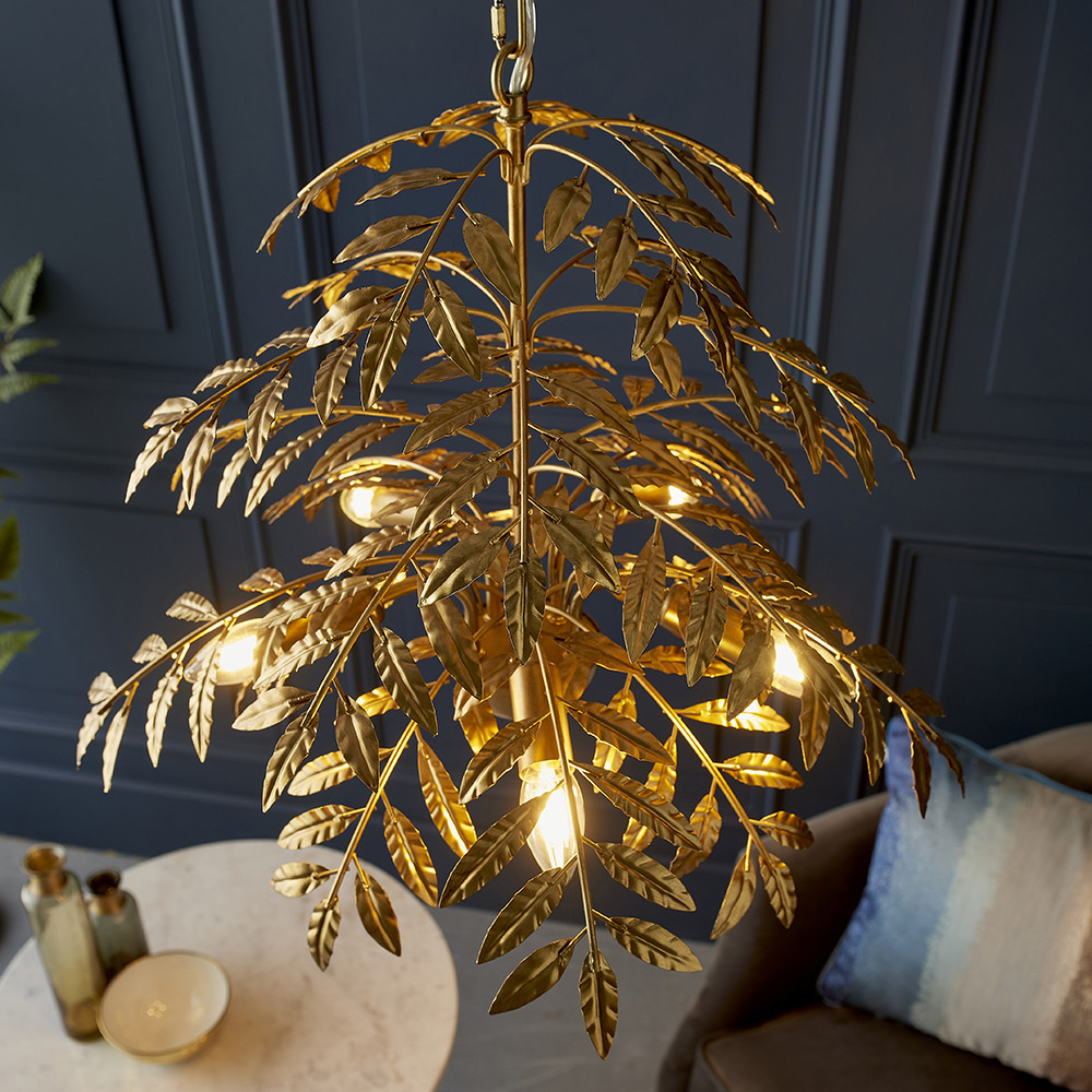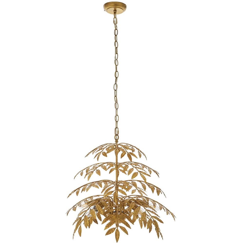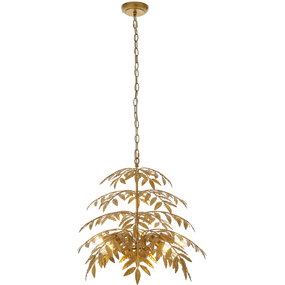 The Merano Anzio Distressed Gold 5-Light Pendant Ceiling Light adds a touch of elegance to any room. Featuring decorative palm leaves, this fixture creates a stunning focal point, complementing both contemporary and traditional interior design schemes. Its versatile design enhances any space.