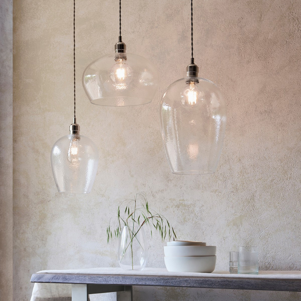 Enhance your home's ambiance with the Merano Livorno pendant ceiling light. Its bright nickel plate finish and clear, ribbed glass dome, elegantly hammered, diffuse light beautifully when paired with twin filament lamps (not included). Adjust the height to your preference with the included 1.2-meter chain and twisted grey fabric cable. Enjoy the versatility of dimming to suit your mood. This stylish light fixture adds a touch of modern elegance to any room.