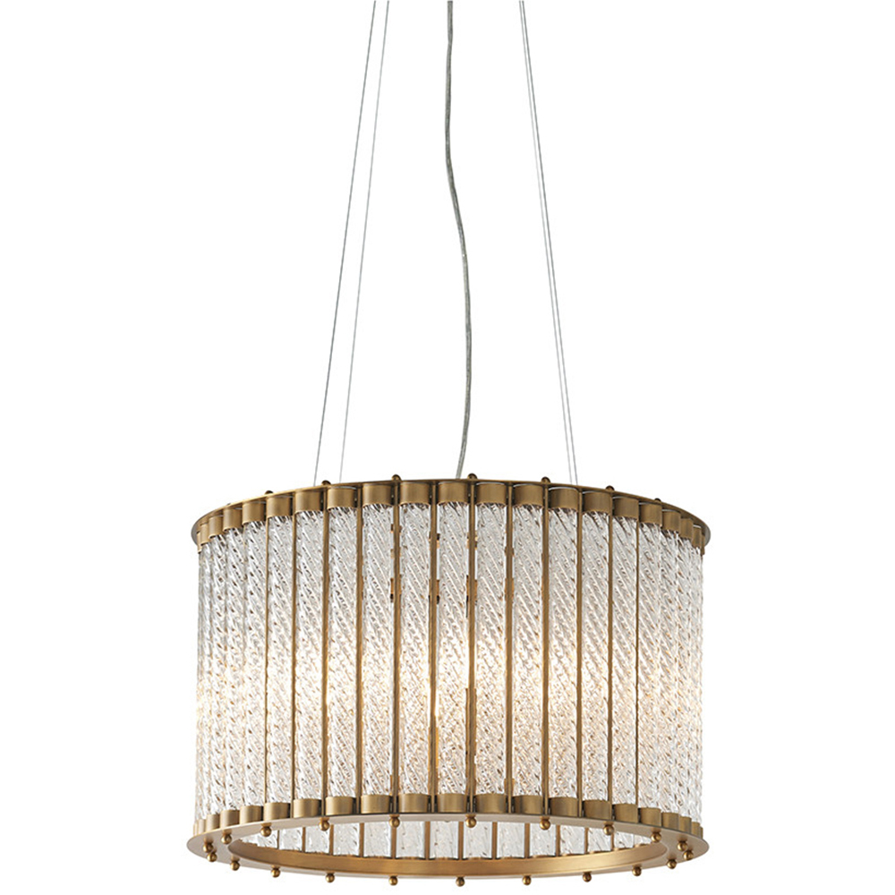 The Merano Naples pendant light features a ribbed glass shade in a lustrous matt gold finish. Suspended from a (details of suspension not provided in original description - consider adding this information if available, e.g., "metal canopy and cable"), its unique design creates a striking visual impact. The clear, twisted glass rods diffuse light effectively, enhancing both the aesthetic and functionality. Requires a lightbulb (not included).
