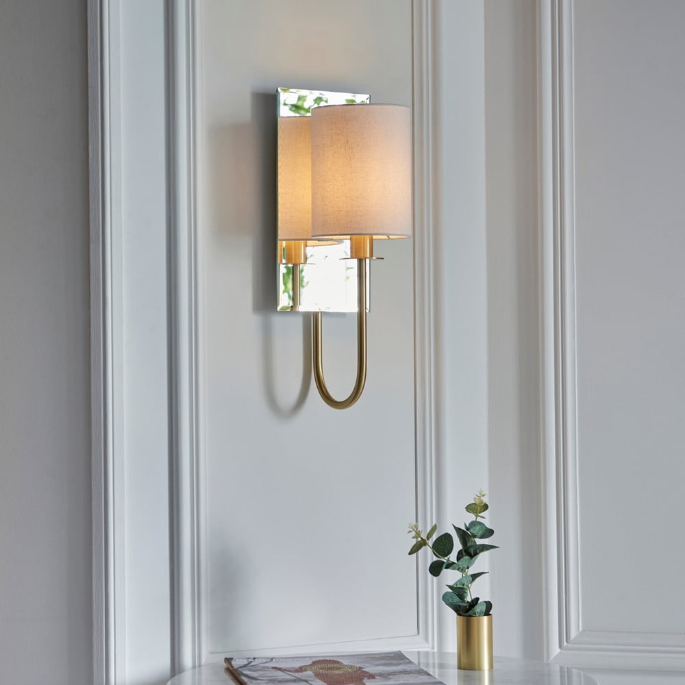 The Merano Pisa wall lamp: a stylish blend of satin brass and vintage white. Its versatile design brightens hallways and entryways with charm. The satin brass plate and fabric shade create a warm ambience, adding a touch of elegance to your home. Requires a lightbulb (sold separately).