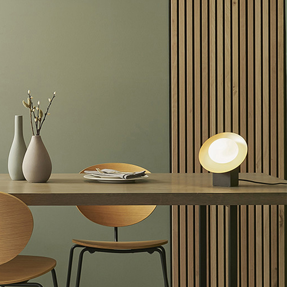 The Merano Tivoli table lamp, in gold and dark bronze, adds a touch of elegance to living rooms, dining rooms, or entryways. Its opal glass shade, complemented by a gold shade and bronze base, diffuses a soft light. This versatile lamp suits both classic and contemporary interiors.